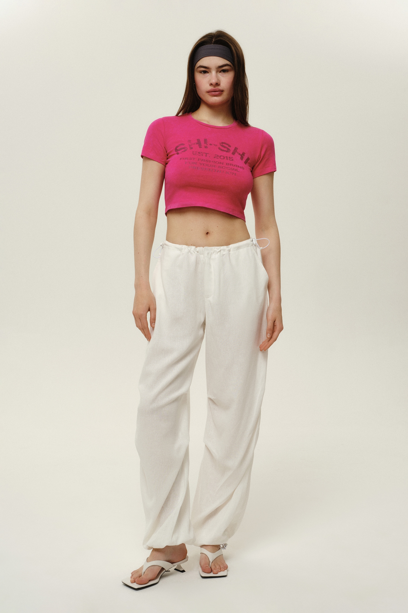 Короткая футболка из хлопка в стиле гранж. Вареный эффект, облегающий силуэт и фирменная надпись на груди. Стилизуйте топ с оверсайз джинсами на заниженной талии, спортивными брюками с защипами или макси юбкой. Представлены в трех цветах.