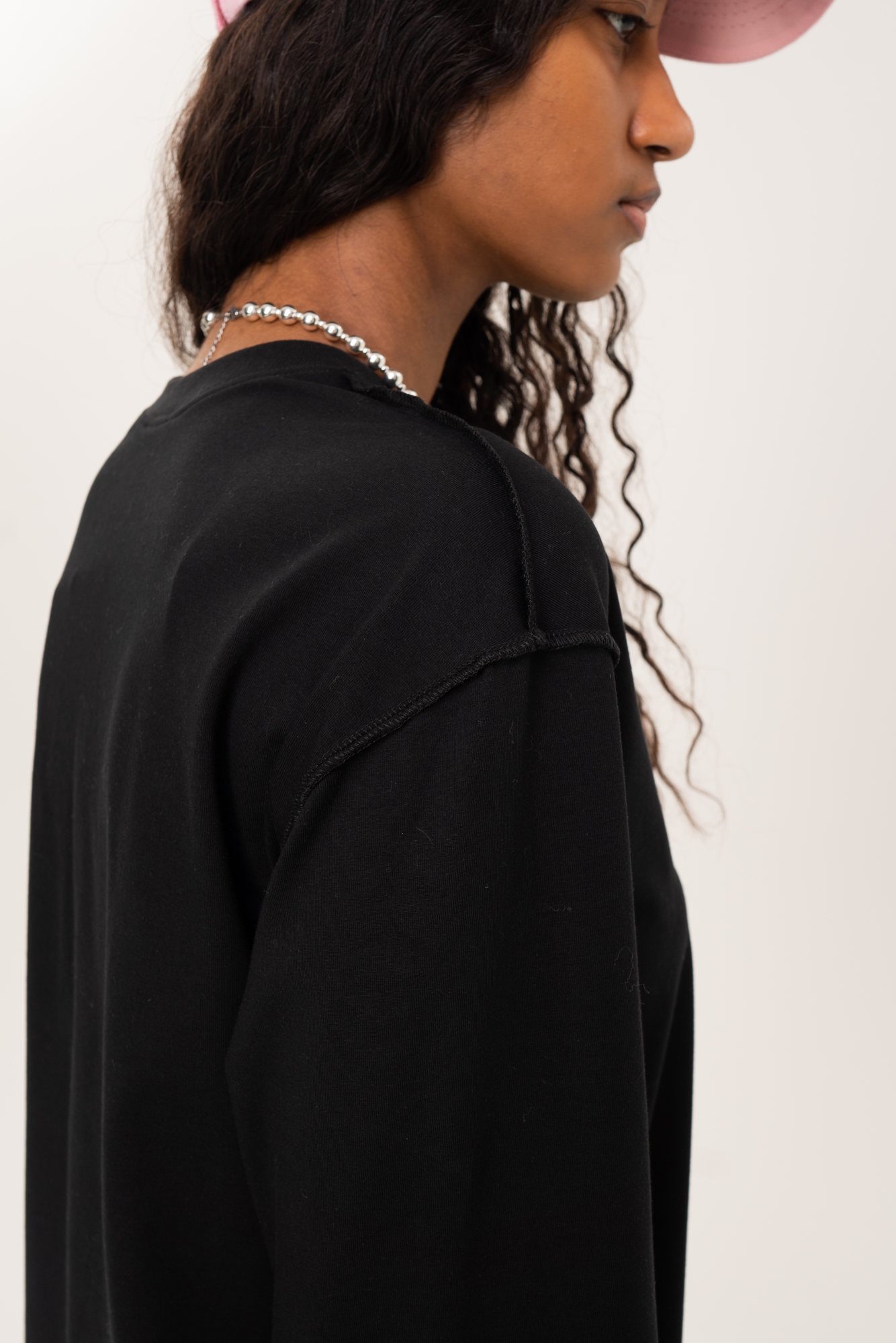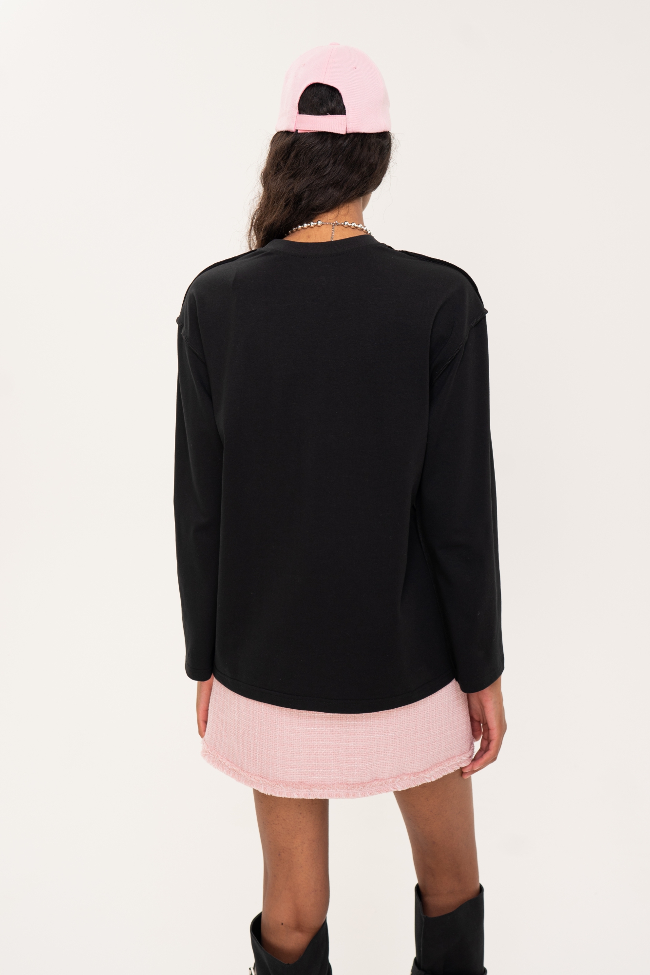 Молочный лонгслив в прочтении SHI-SHI – иллюстрация того, какой может быть база: нетривиальной и нескучной. Свободный лонгслив со спущенной линией плеча дополнен швами, выведенными на лицевую сторону. Стилизуйте его по-максимому и с чем угодно.