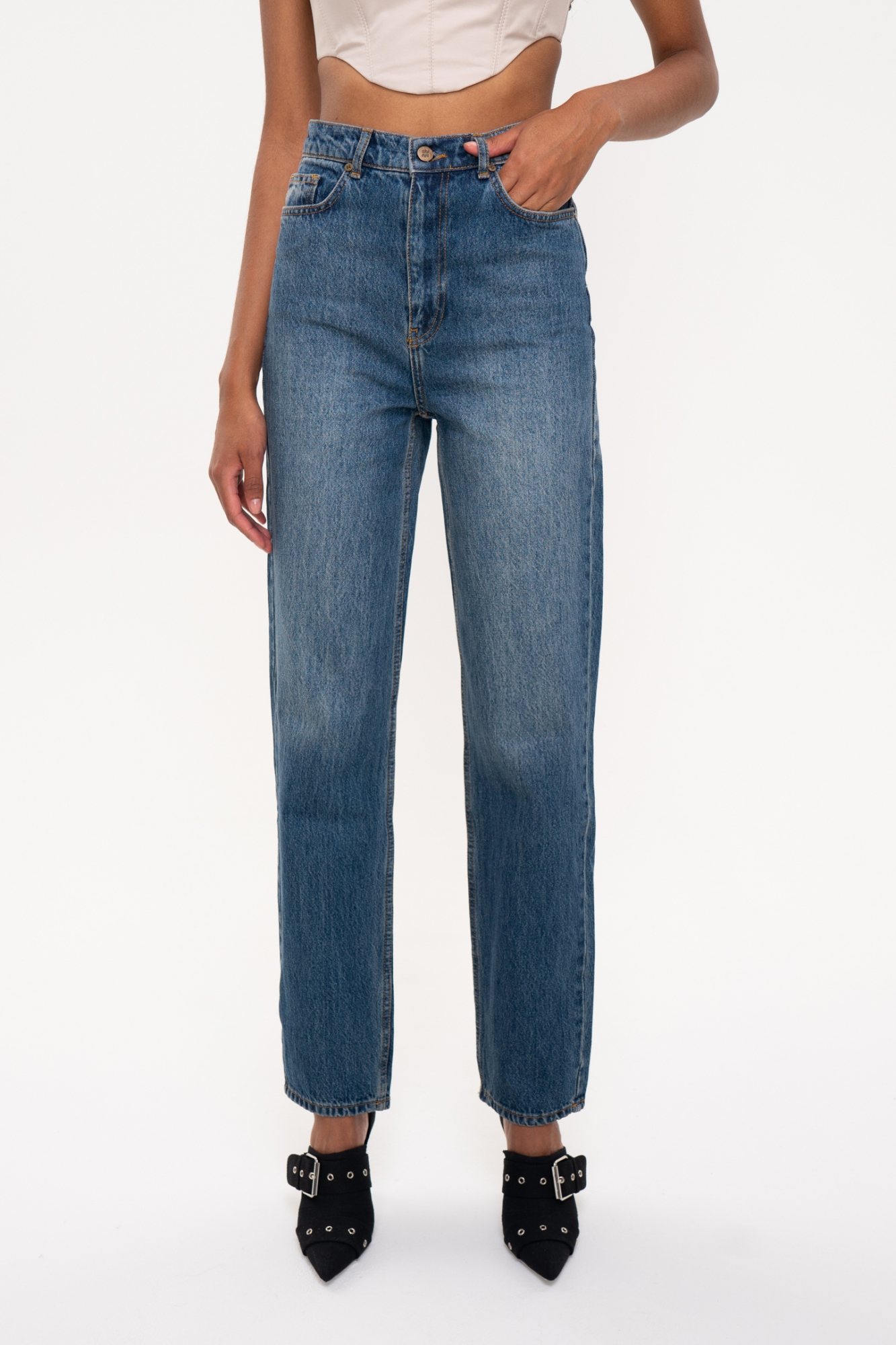 Базовые джинсы прямого кроя. Плотный деним, высокая посадка, синий цвет с эффектом легкой потертости. Изделие подчеркивает стройность ног. Незаменимый элемент повседневных образов.
