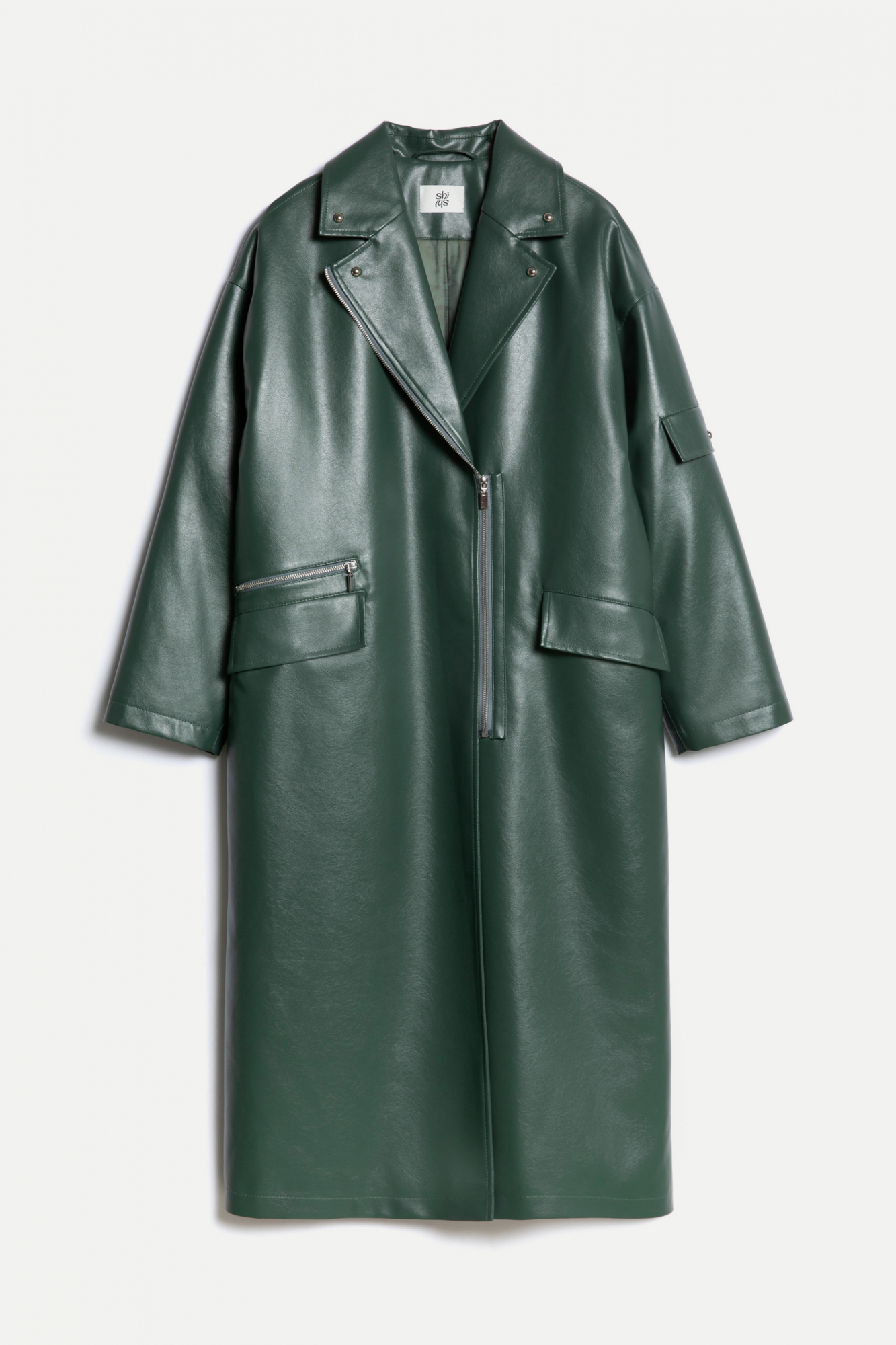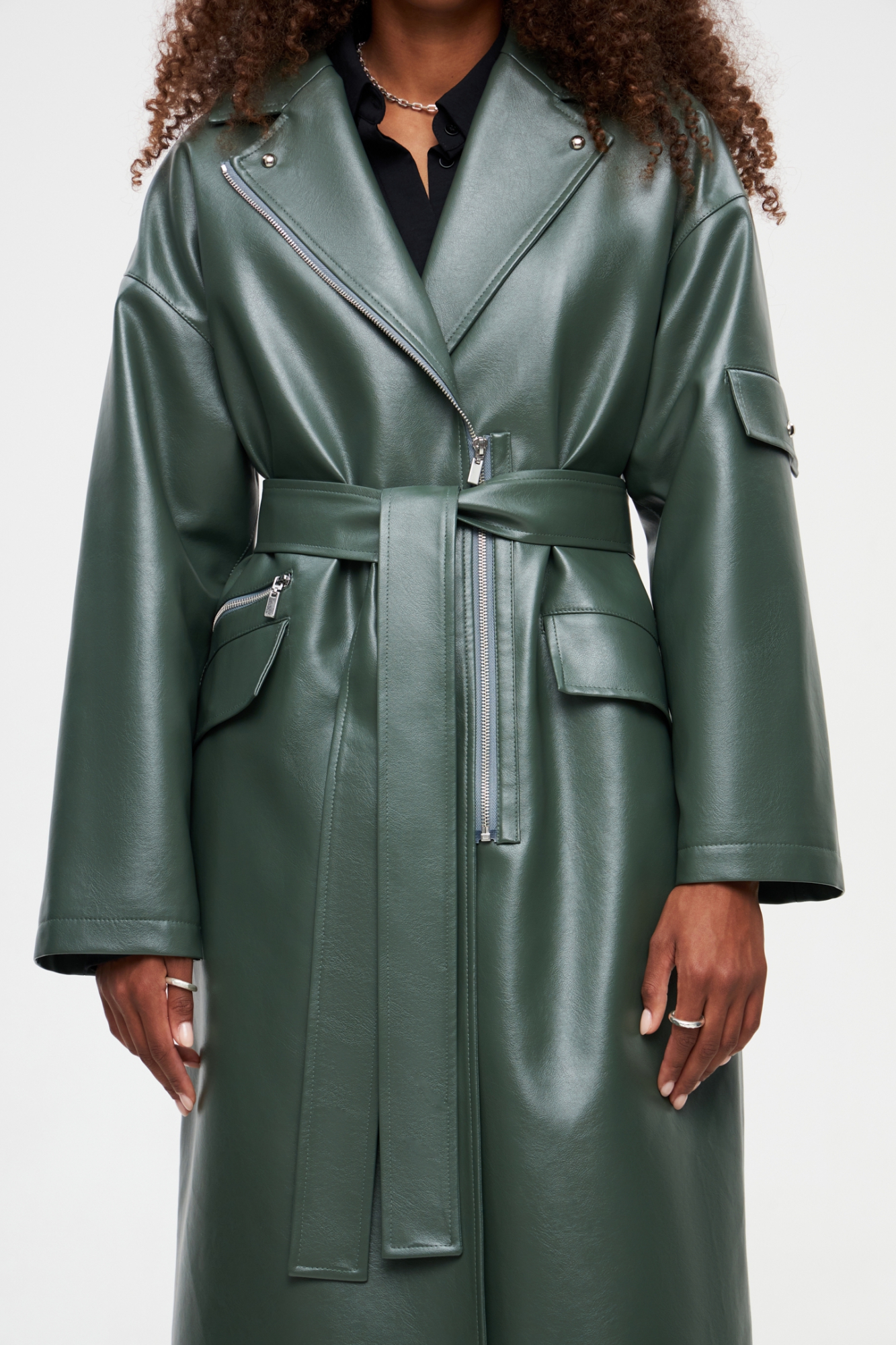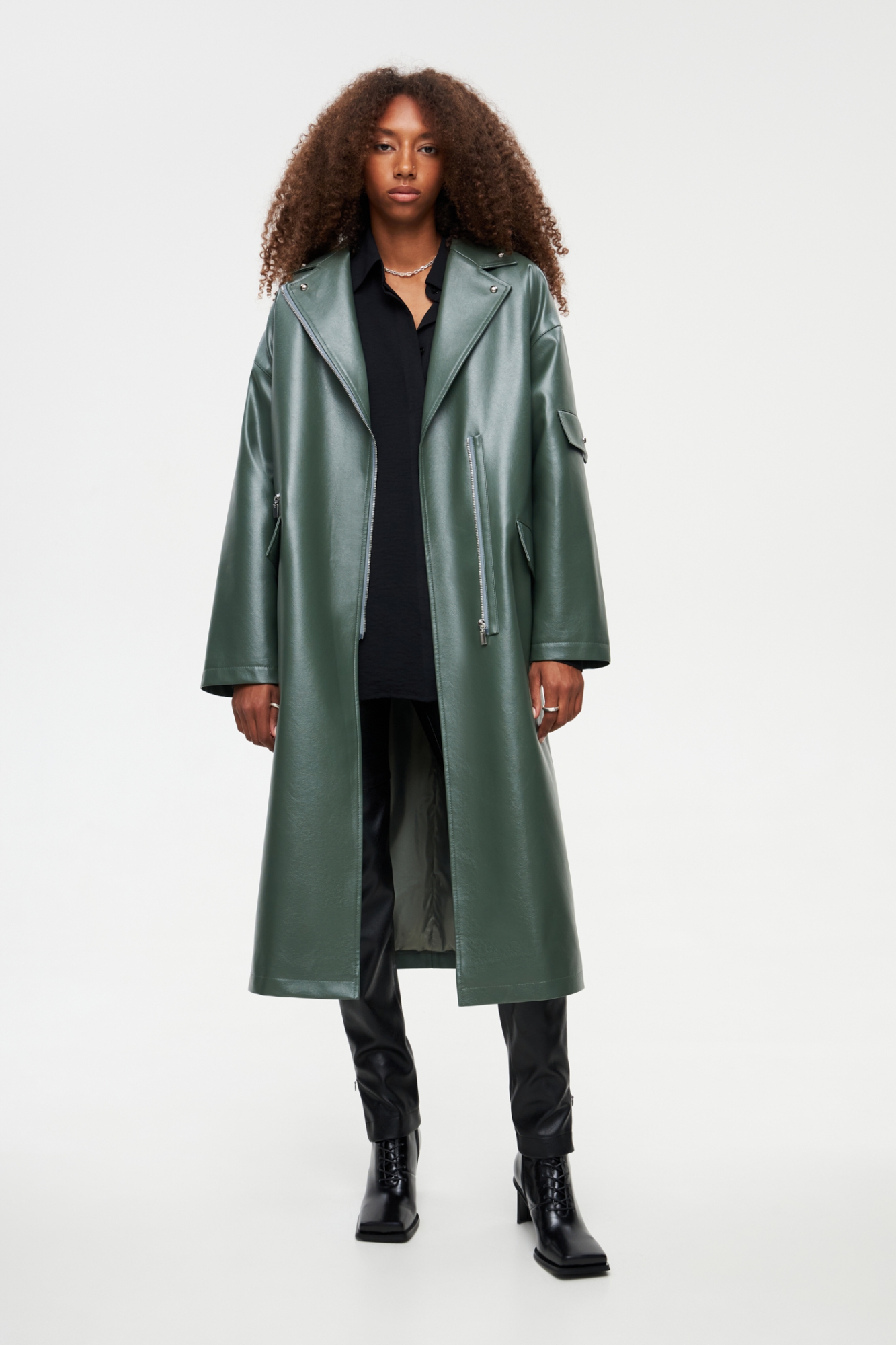 Утеплённое пальто из эко-кожи. У модели классический воротник, спущенное плечо и застёжка-молния. Пальто свободного кроя, в комплекте есть широкий пояс, с помощью которого можно подчеркнуть линию талии. Имеются два кармана с клапанами, а также декоративный элемент на левом рукаве и дополнительные молнии спереди и сзади.