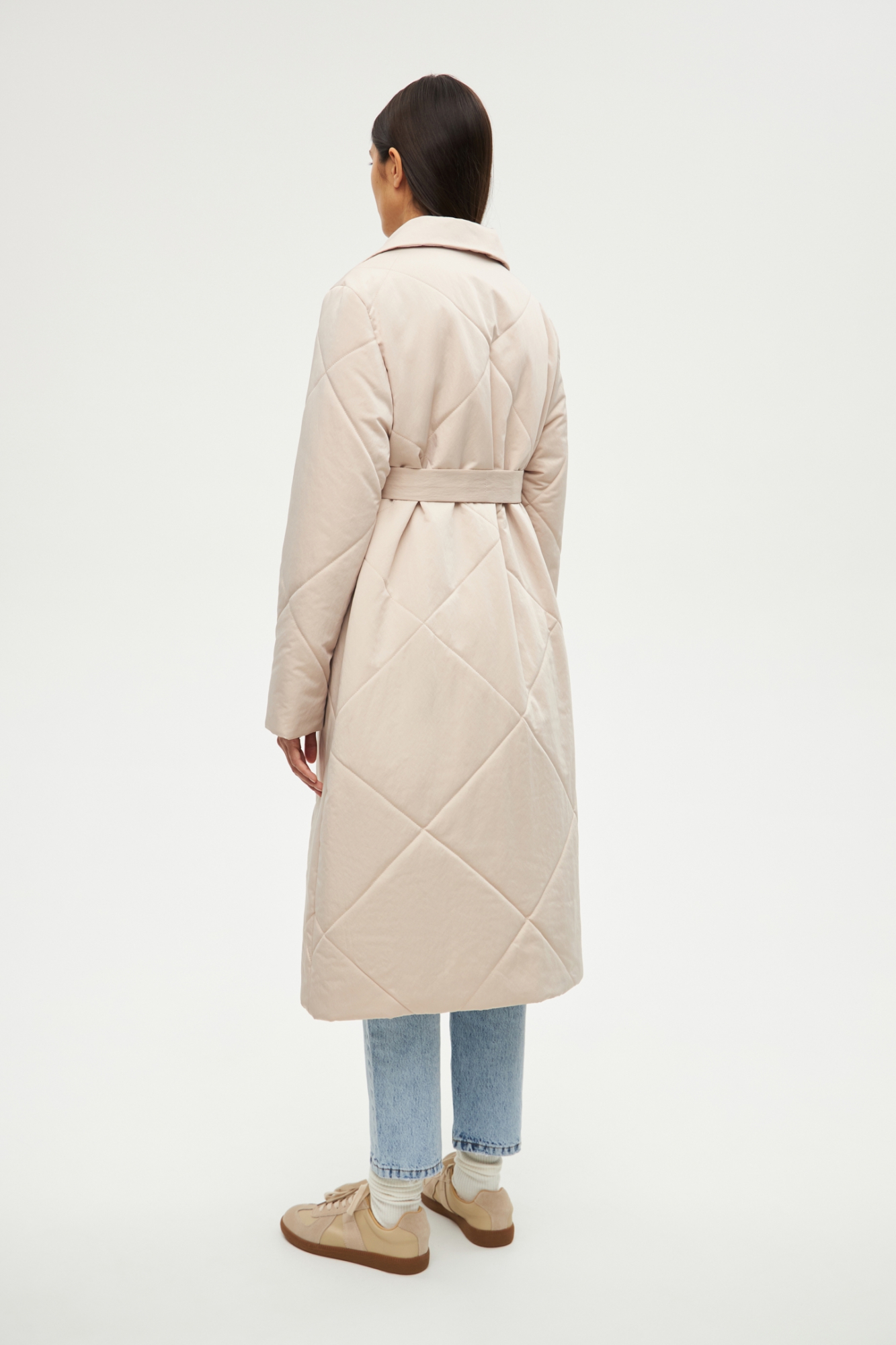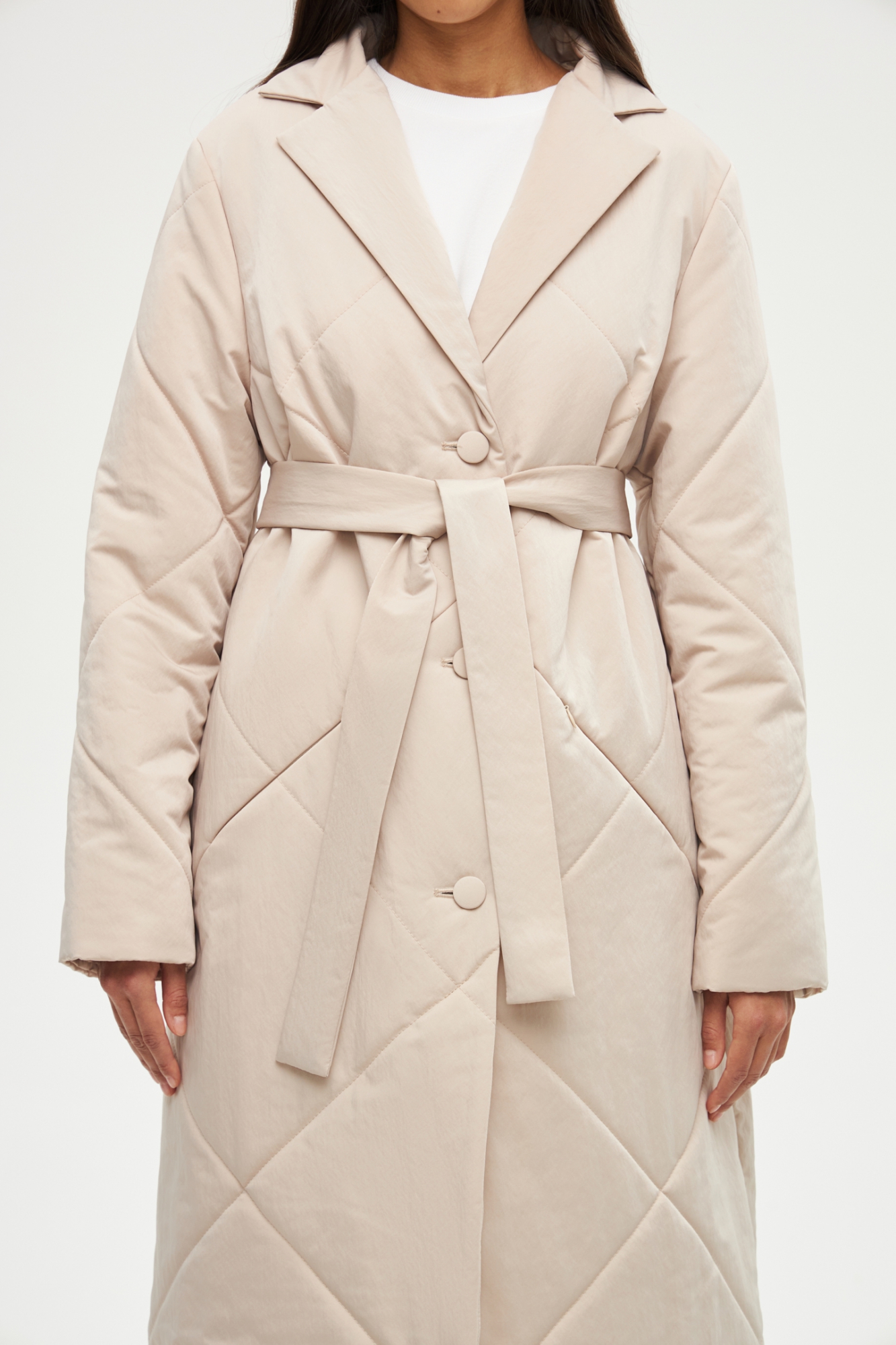 Стёганое однобортное пальто трапецивидного силуэта. Застёгивается на три пуговицы. Спереди - прорезные карманы с потайными молниями. Модель выполнена из плащёвой ткани на сверхтехнологичном утеплителе. Благодаря ему пальто очень лёгкое, воздушное и согреет вас в погоду от 0/-5°C до -10°C в зависимости от выбранной плотности утепления.