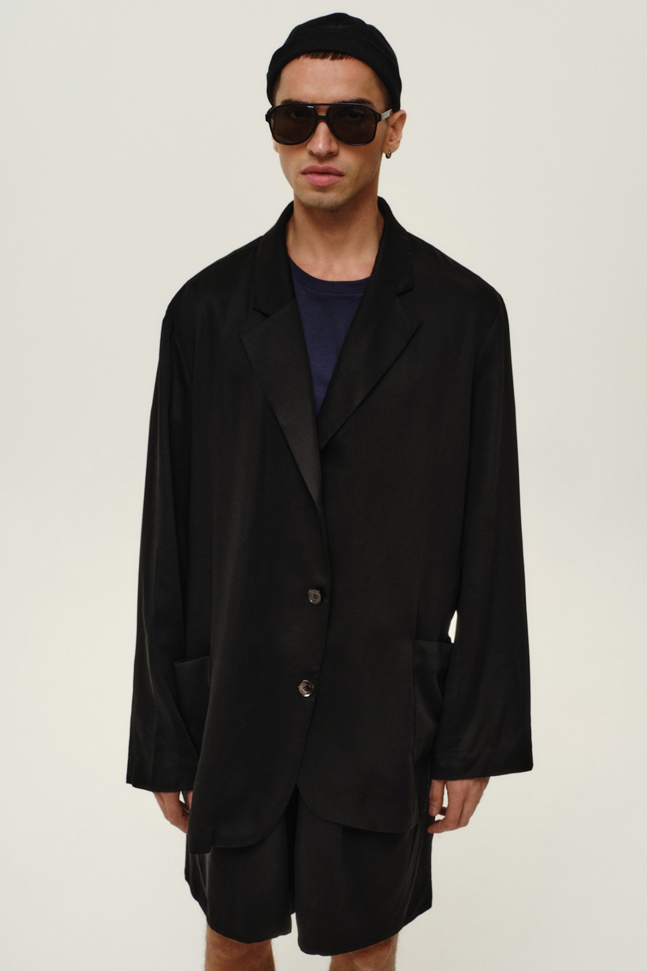 Элегантный кафтан свободного кроя. Атласный материал глубокого черного цвета и идеальные лацканы. Добавьте базовый низ, чтобы сбалансировать образ.
