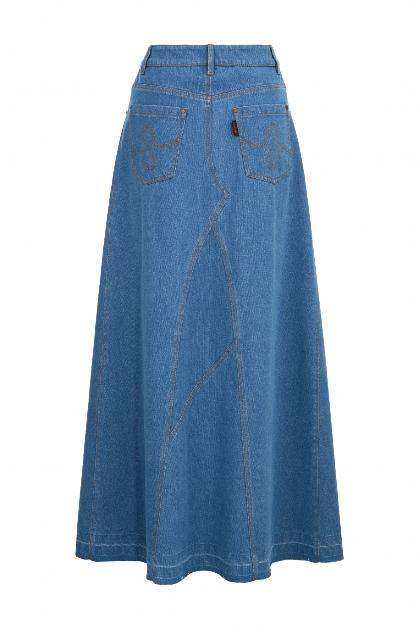 Юбка-макси расклешённого силуэта подойдет любому типу фигуры, визуально вытягивая ее за счет длины и декоративных швов. Интересный крой модели имитирует как будто перешитые джинсы бойфренда, придавая дерзости образу. Сочетайте ее со свитером, рубашкой или корсетом – она станет идеальным денимом на каждый день. Изделие дополнено шлицами для ремня и карманами по боковым швам.