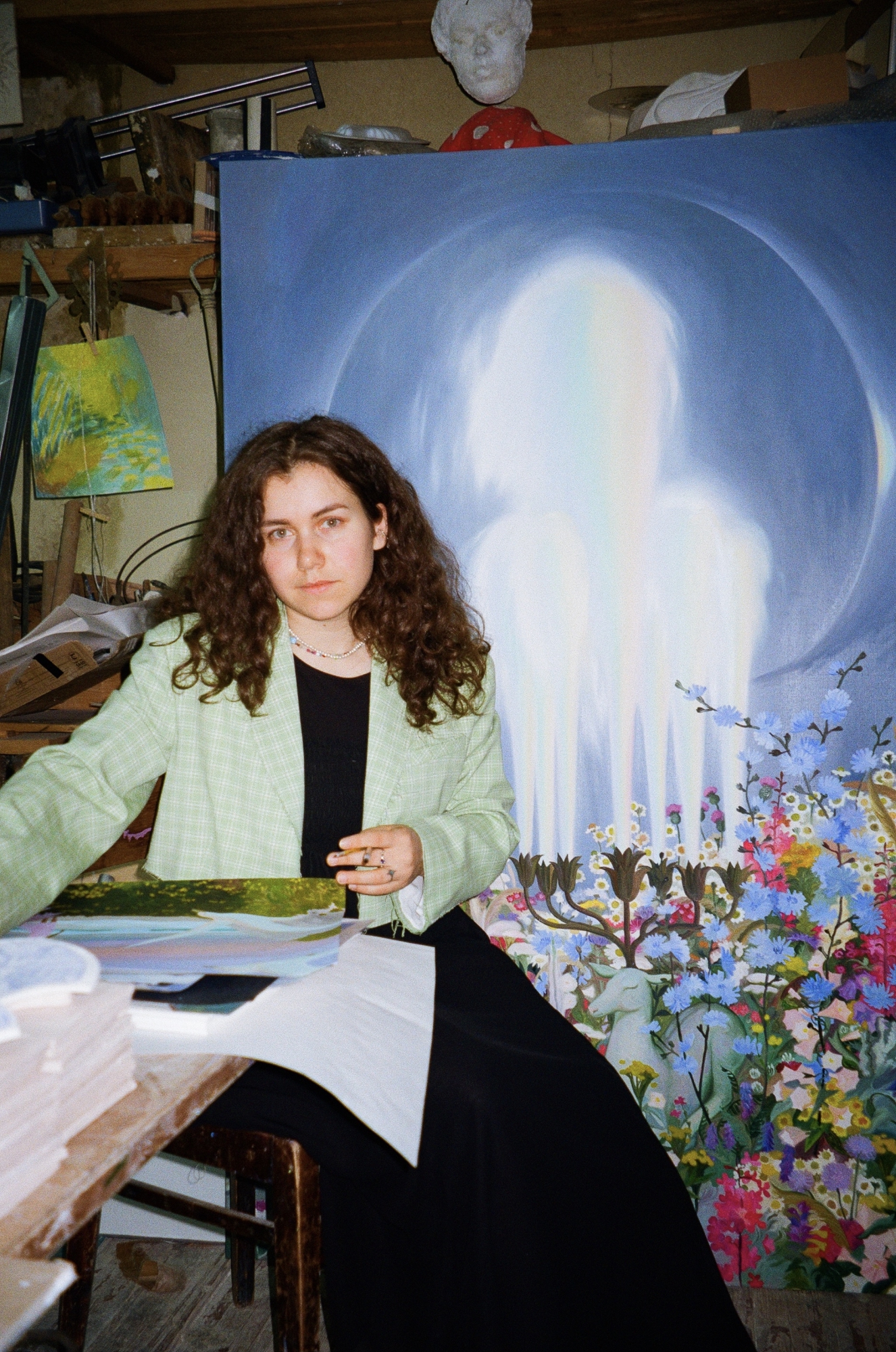 Уважение к авторам труда и желание показывать их ценность вылилось в совместную работу с вдохновленной и исследующей художницей из Москвы. Женя Дудникова — выпускница «Строгановки» и школы «Свободные мастерские» — видит мир по-особенному: её полотна через цвета и образы передают чувства, эмоции и «рисуют» свою аутентичную вселенную. Наша команда увидела в них тонкую связь с разрабатываемыми изделиями летней капсулы, поэтому мы предложили Евгении вместе создать событие, объединяющее искусство и моду.