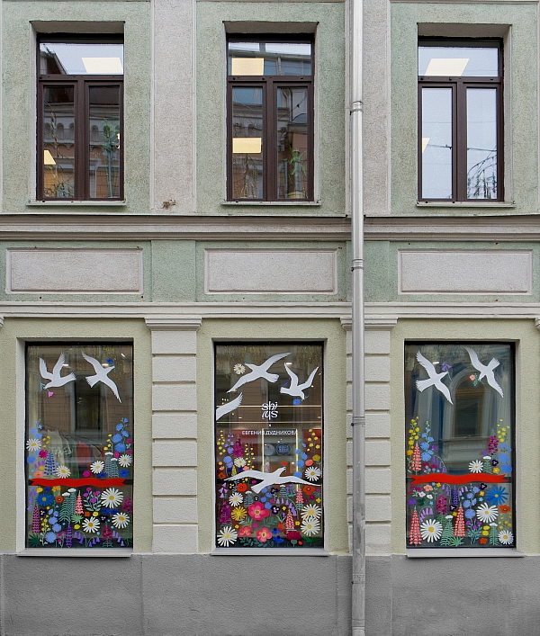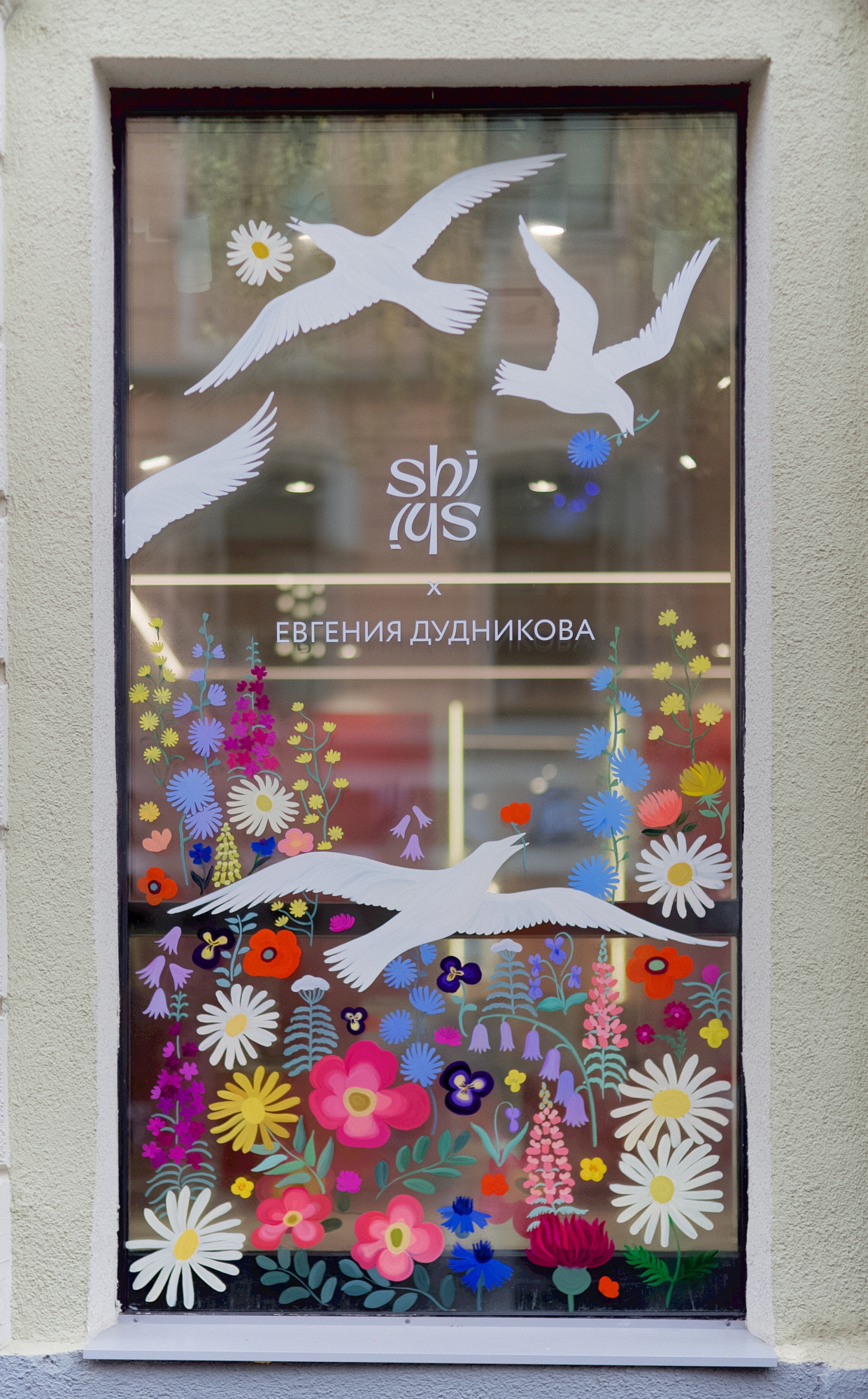 Картины современной художницы, пропитанные свободой, романтикой и летом, украсили пространство бутика, появились на брендированной упаковке и открытках, а сама Женя искусно разместила на окнах флагманского магазина цветущий сад.