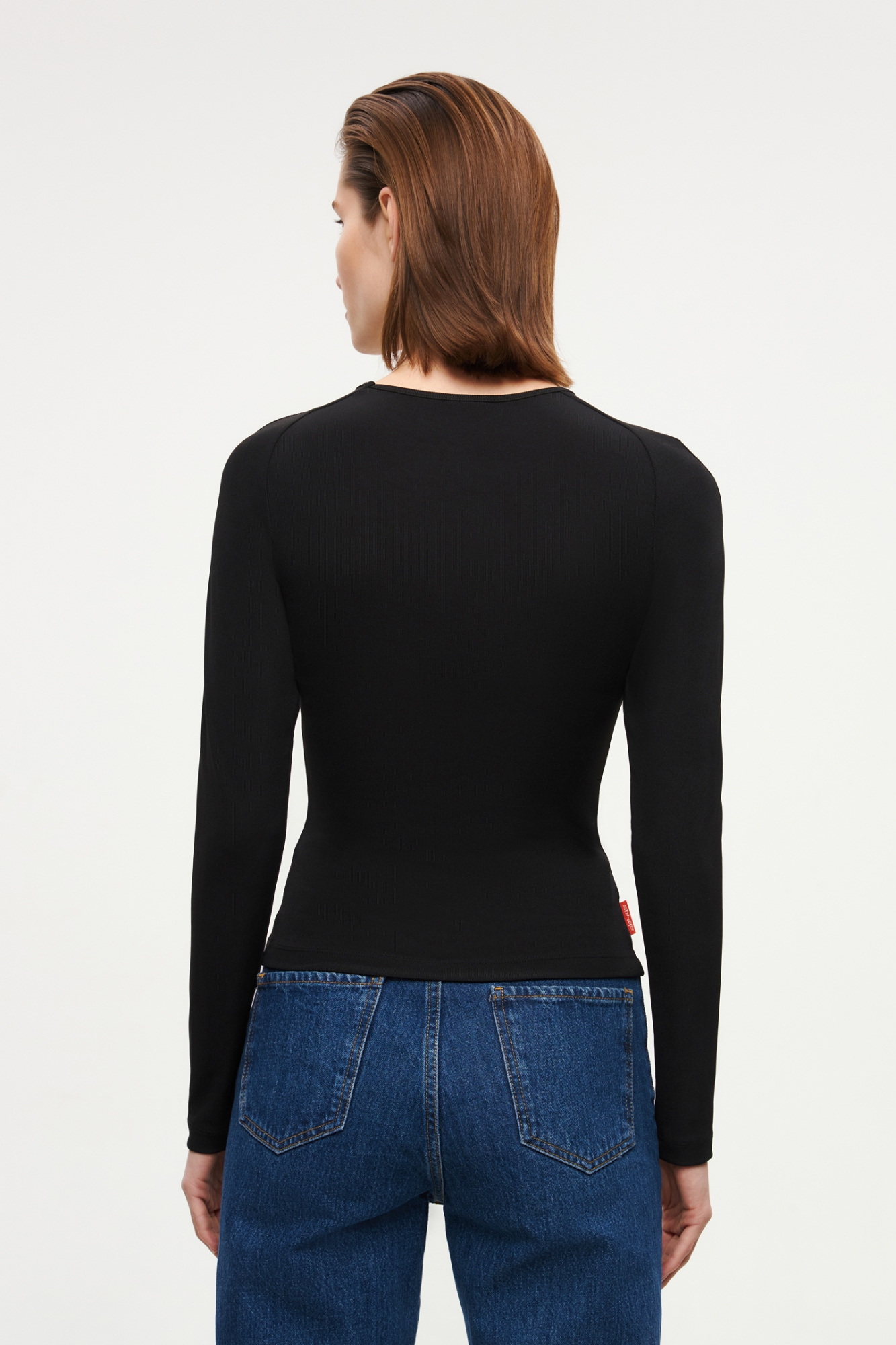 Вам обязательно стоит заручиться поддержкой базового лонгслива SHI-SHI хотя бы в одном цвете. Благодаря облегающему крою и ткани в составе с вискозой эта модель играет роль второй кожи.