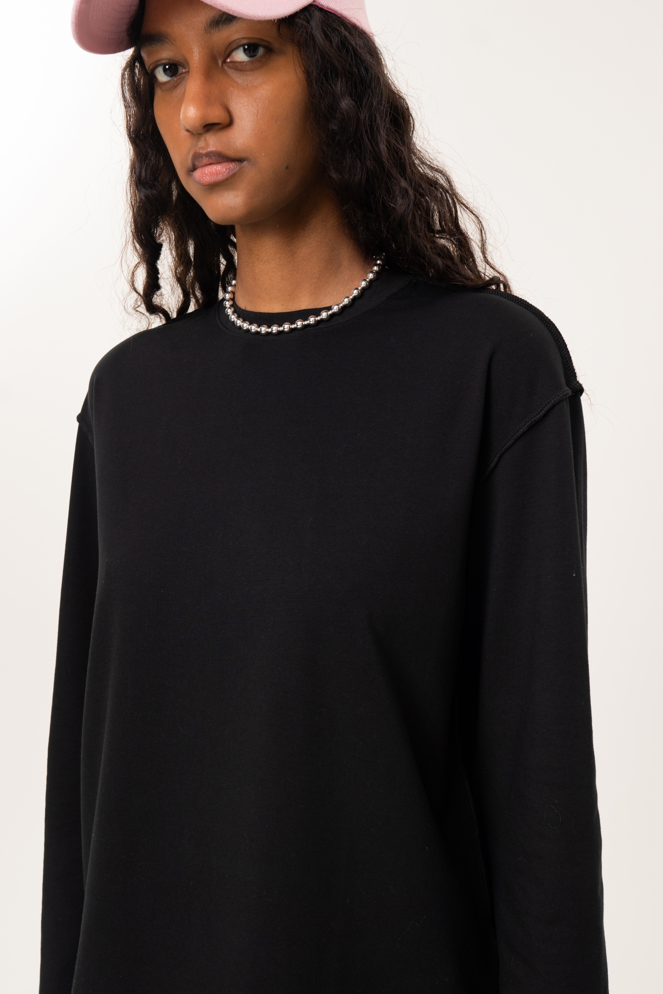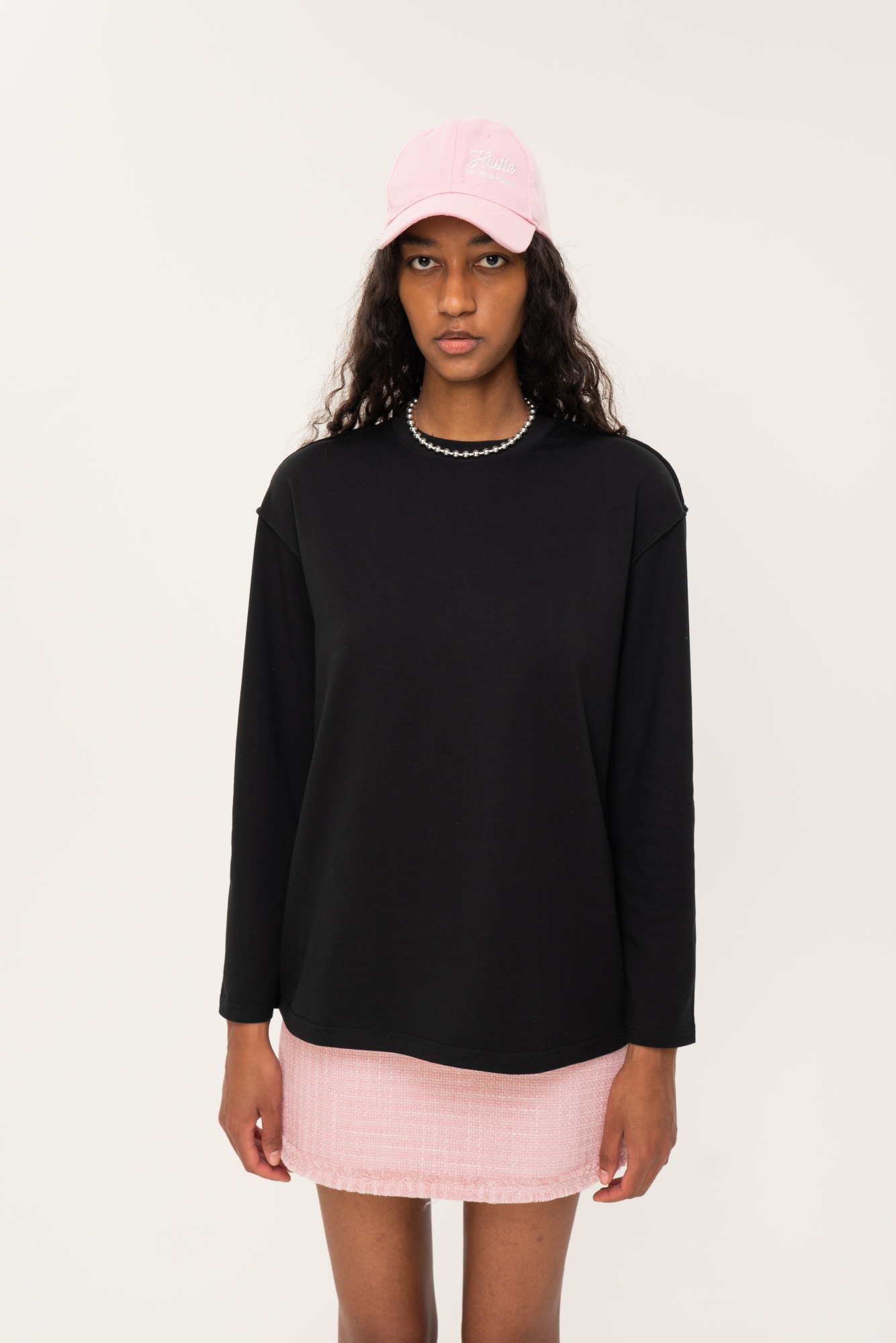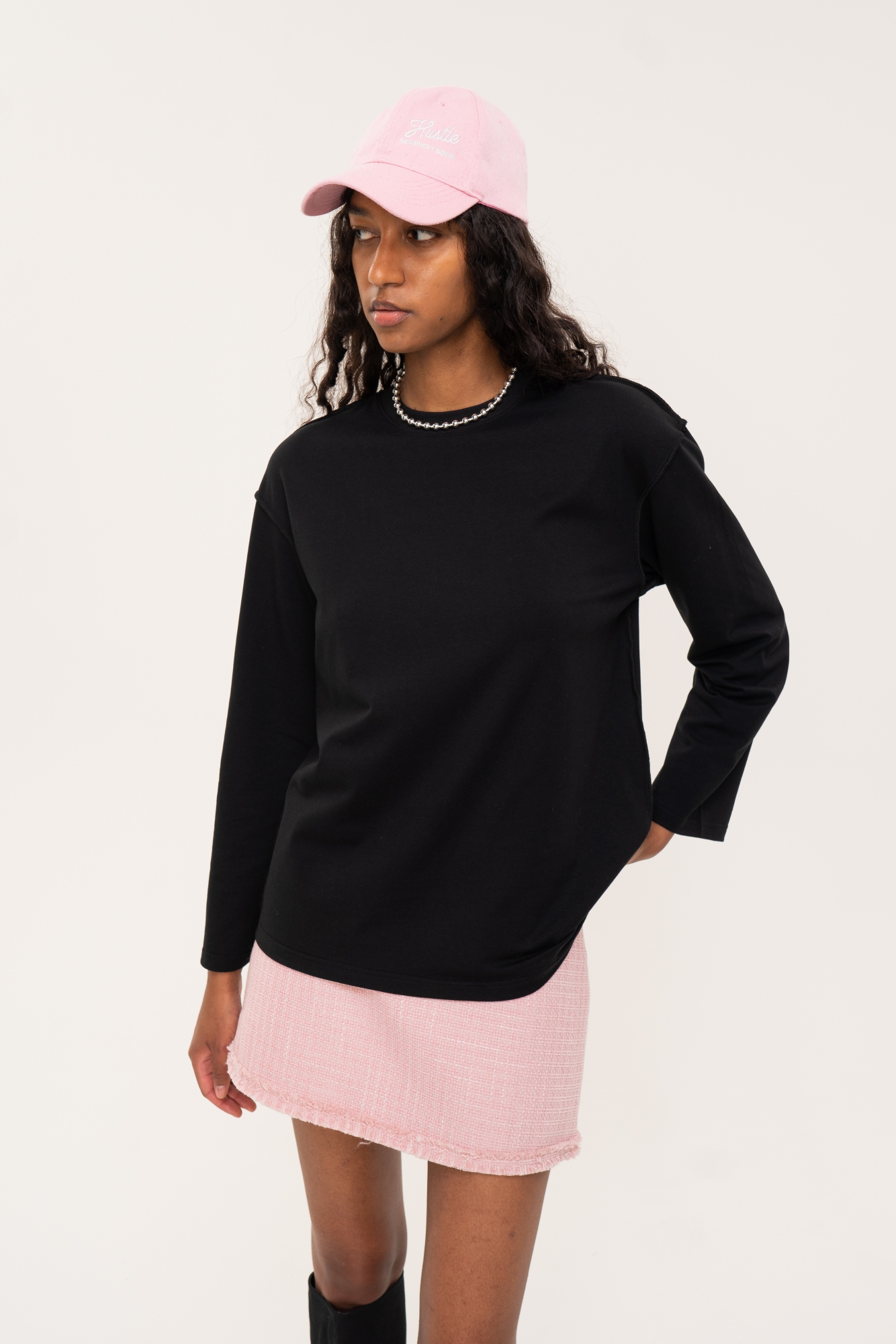 Молочный лонгслив в прочтении SHI-SHI – иллюстрация того, какой может быть база: нетривиальной и нескучной. Свободный лонгслив со спущенной линией плеча дополнен швами, выведенными на лицевую сторону. Стилизуйте его по-максимому и с чем угодно.