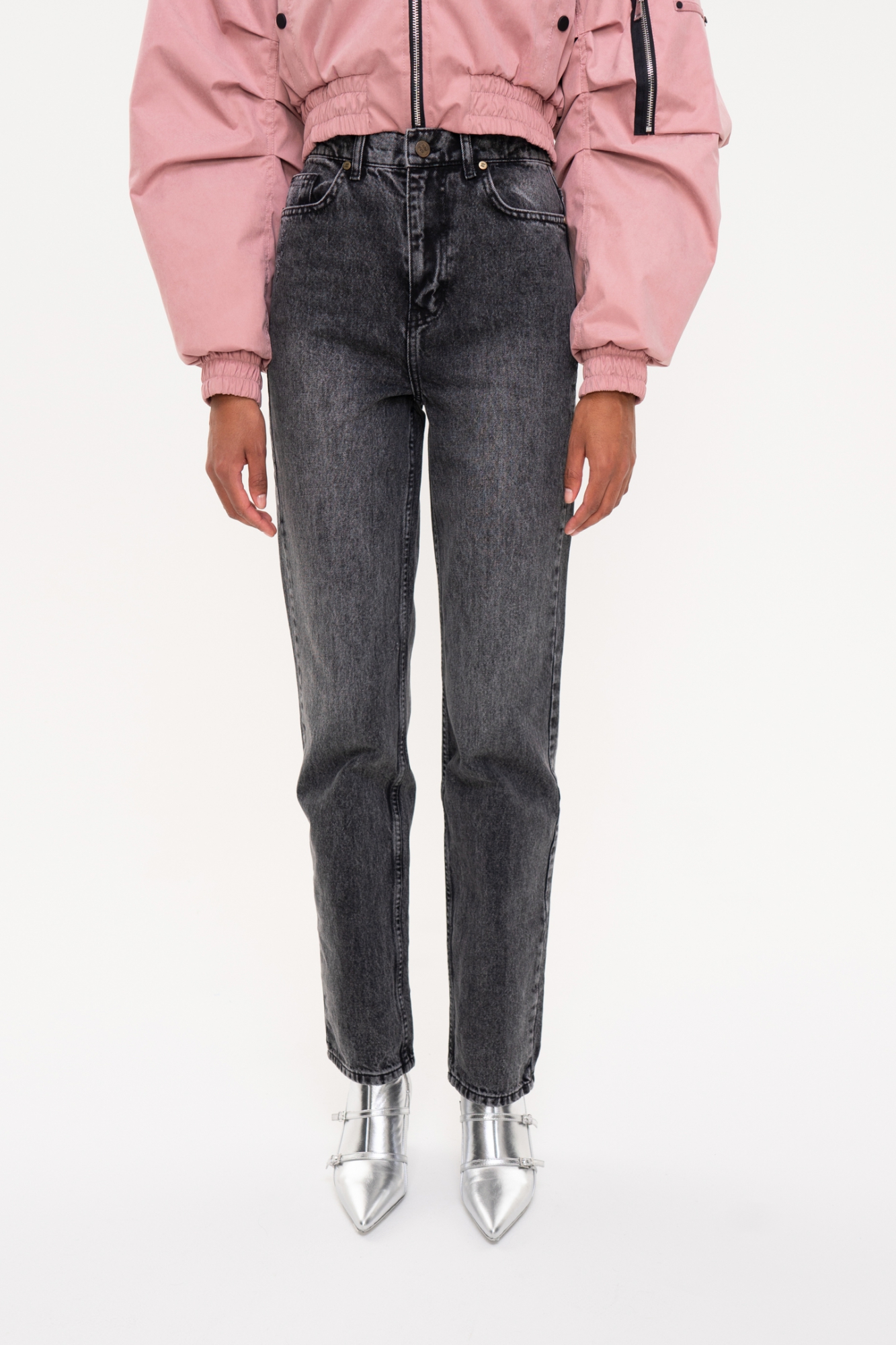 Базовые джинсы прямого кроя. Плотный деним, высокая посадка, графитовый цвет с эффектом легкой потертости. Изделие подчеркивает стройность ног. Незаменимый элемент повседневных образов.