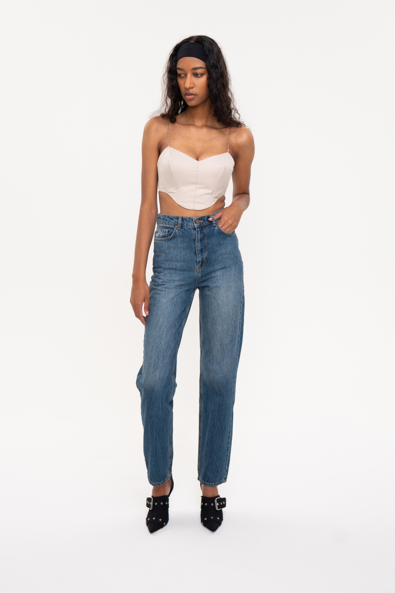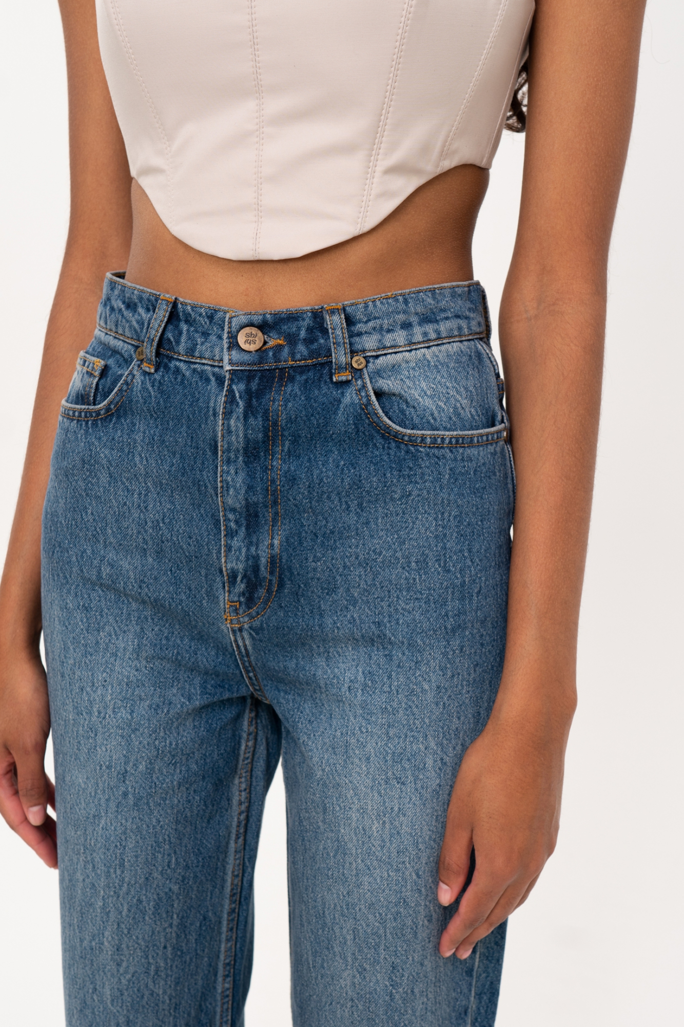 Базовые джинсы прямого кроя. Плотный деним, высокая посадка, синий цвет с эффектом легкой потертости. Изделие подчеркивает стройность ног. Незаменимый элемент повседневных образов.