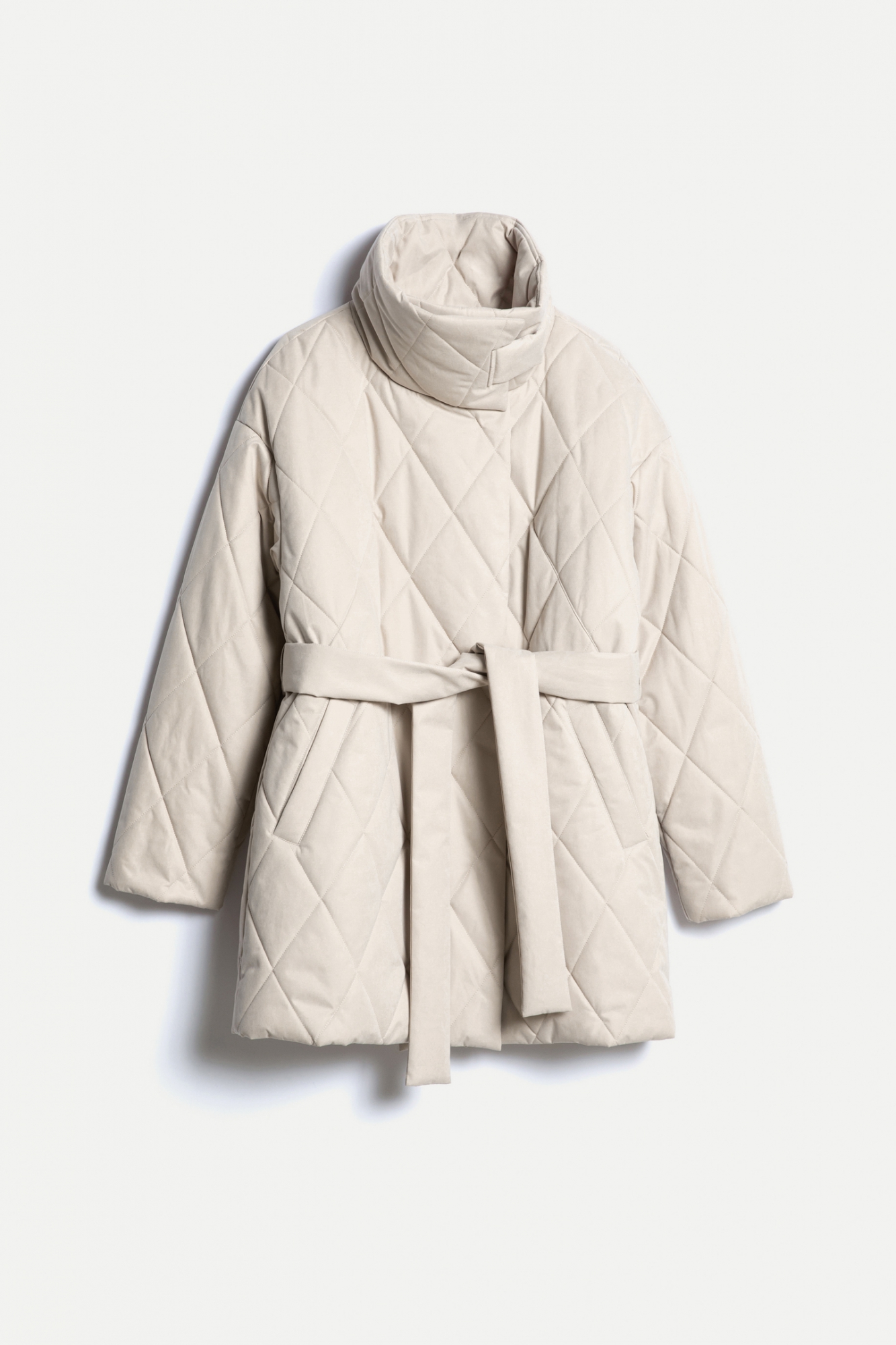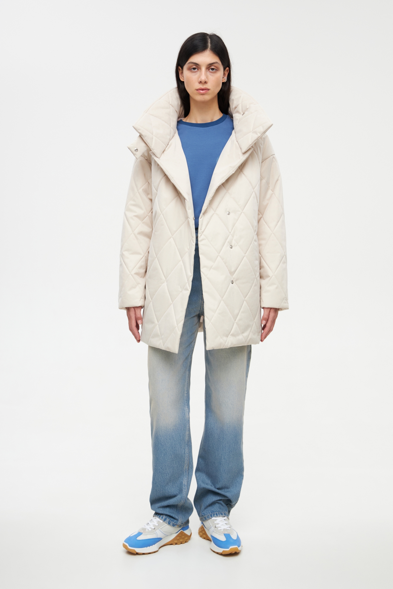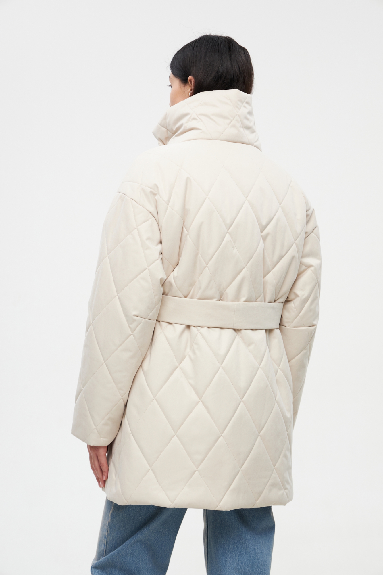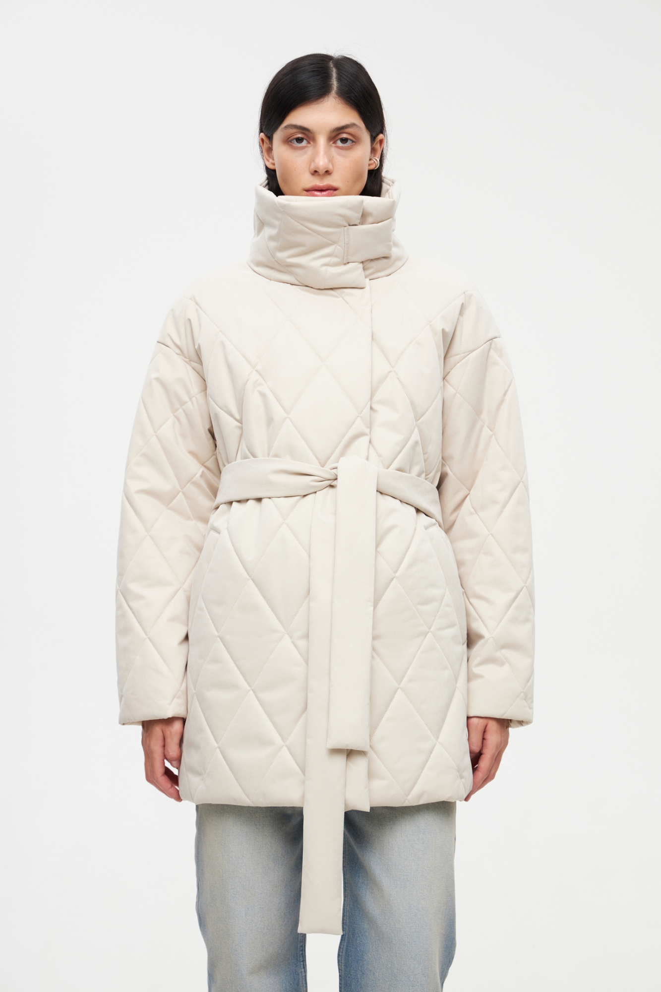 Стёганая куртка со стойкой взяла в себя лучшее от наших пальто и тёплых пуховиков. Свободный крой и спущенная линия плеча гарантирует комфортную посадку, при желании можно надеть более теплые вещи под неё. Стёганые ромбы визуально удлиняют силуэт, а тканевый пояс подчеркивает линию талии. Высокий ворот на кнопке можно поднять или опустить – зависит от настроения и образа. Плотная ткань имеет водоотталкивающую пропитку и спасает в дождливую прохладную погоду. Одно из основных преимуществ модели – её можно стирать в домашних условиях. Кроме этого, куртка может быть выполнена в двух вариантах утепления: для носки до -5 или -10/-15 градусов. Выбор за вами.