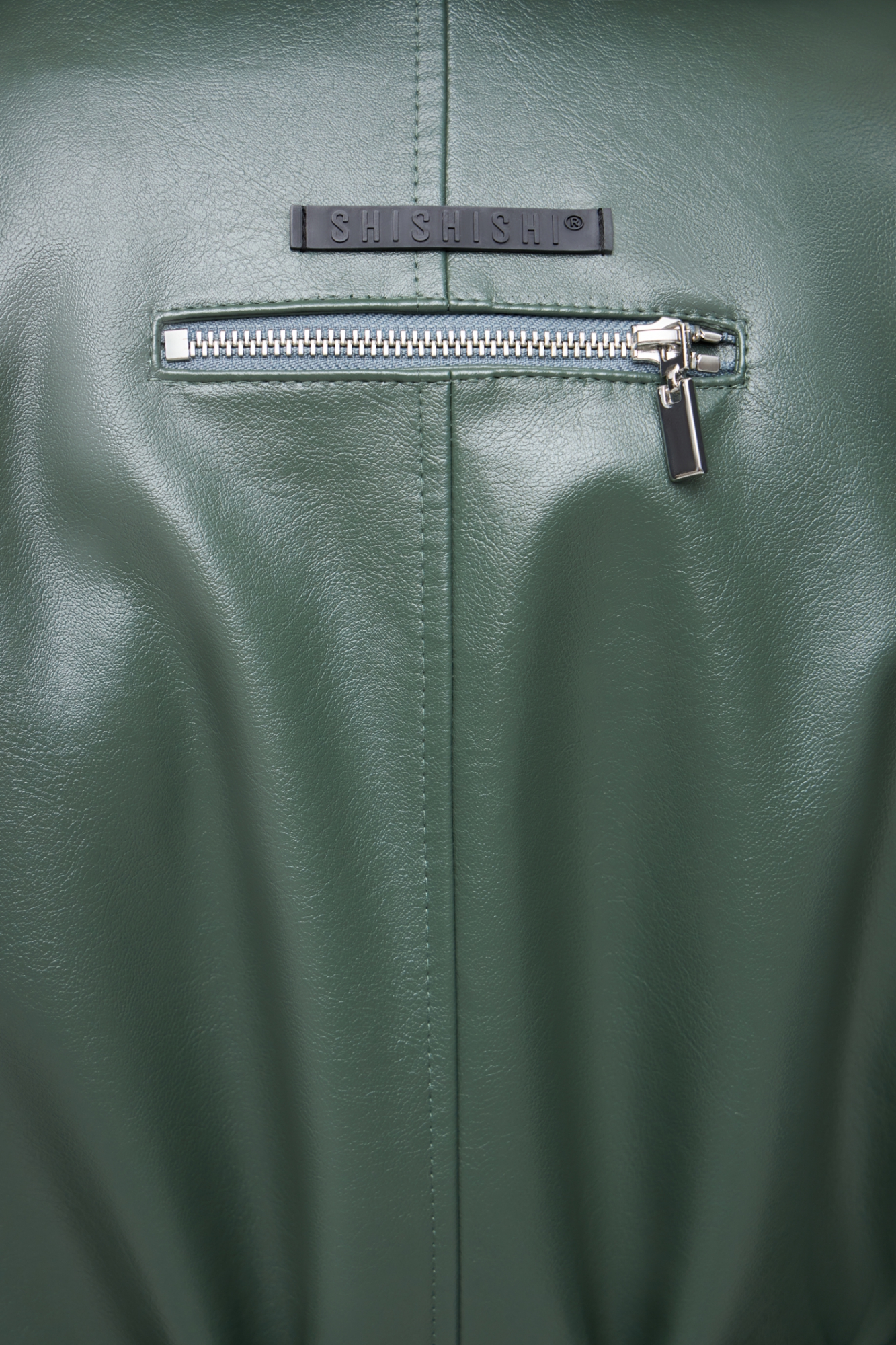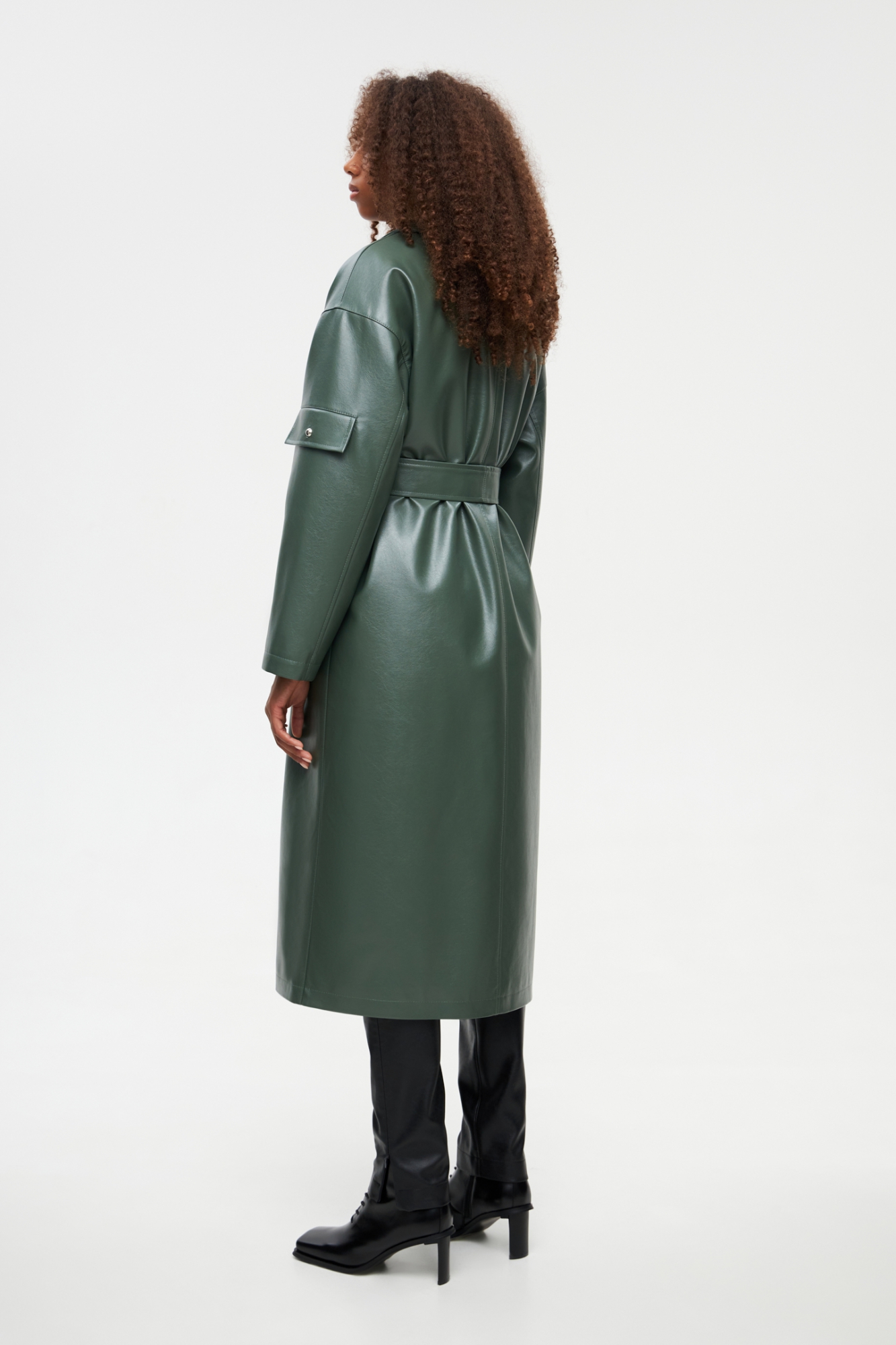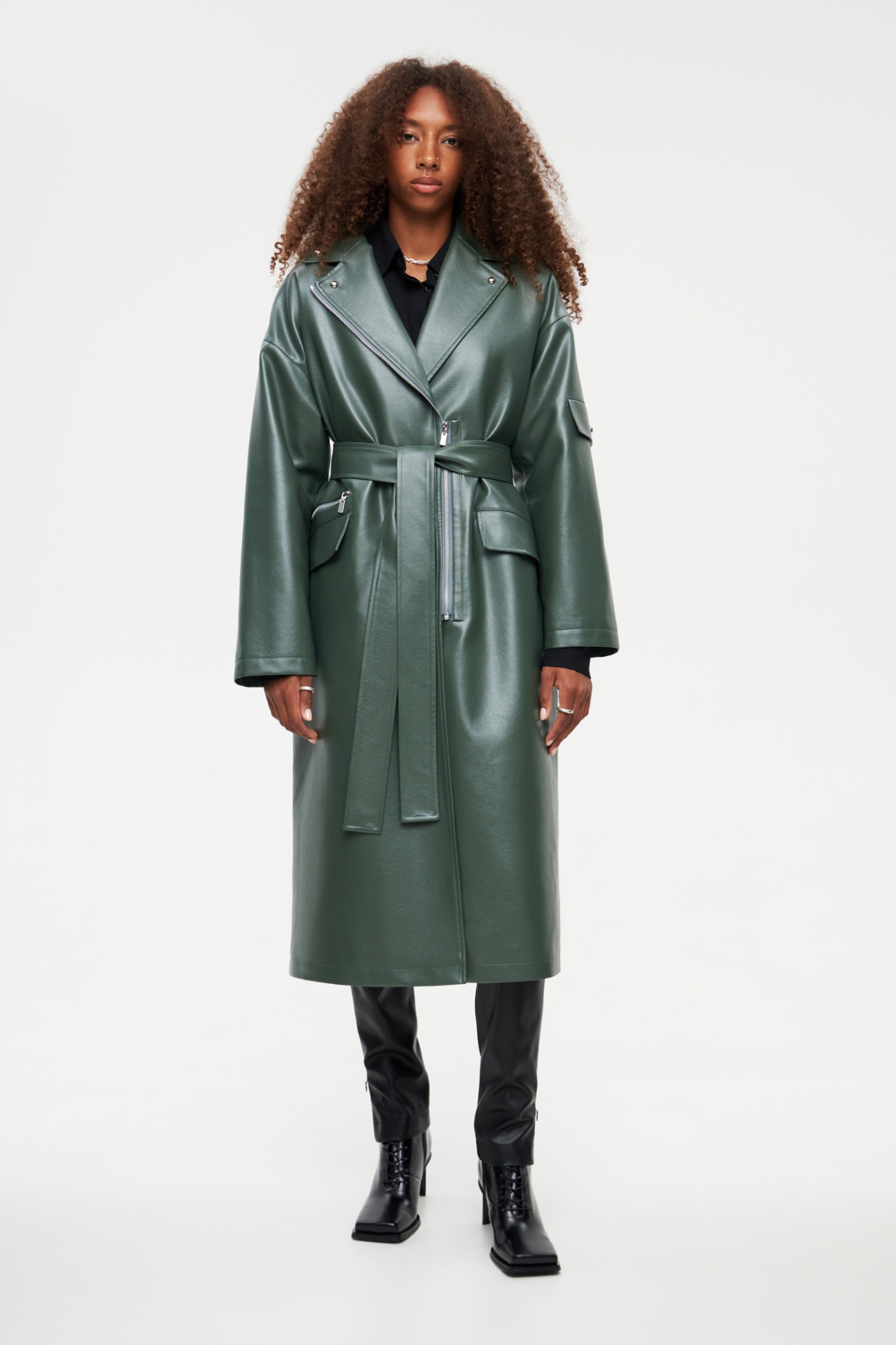 Утеплённое пальто из эко-кожи. У модели классический воротник, спущенное плечо и застёжка-молния. Пальто свободного кроя, в комплекте есть широкий пояс, с помощью которого можно подчеркнуть линию талии. Имеются два кармана с клапанами, а также декоративный элемент на левом рукаве и дополнительные молнии спереди и сзади.