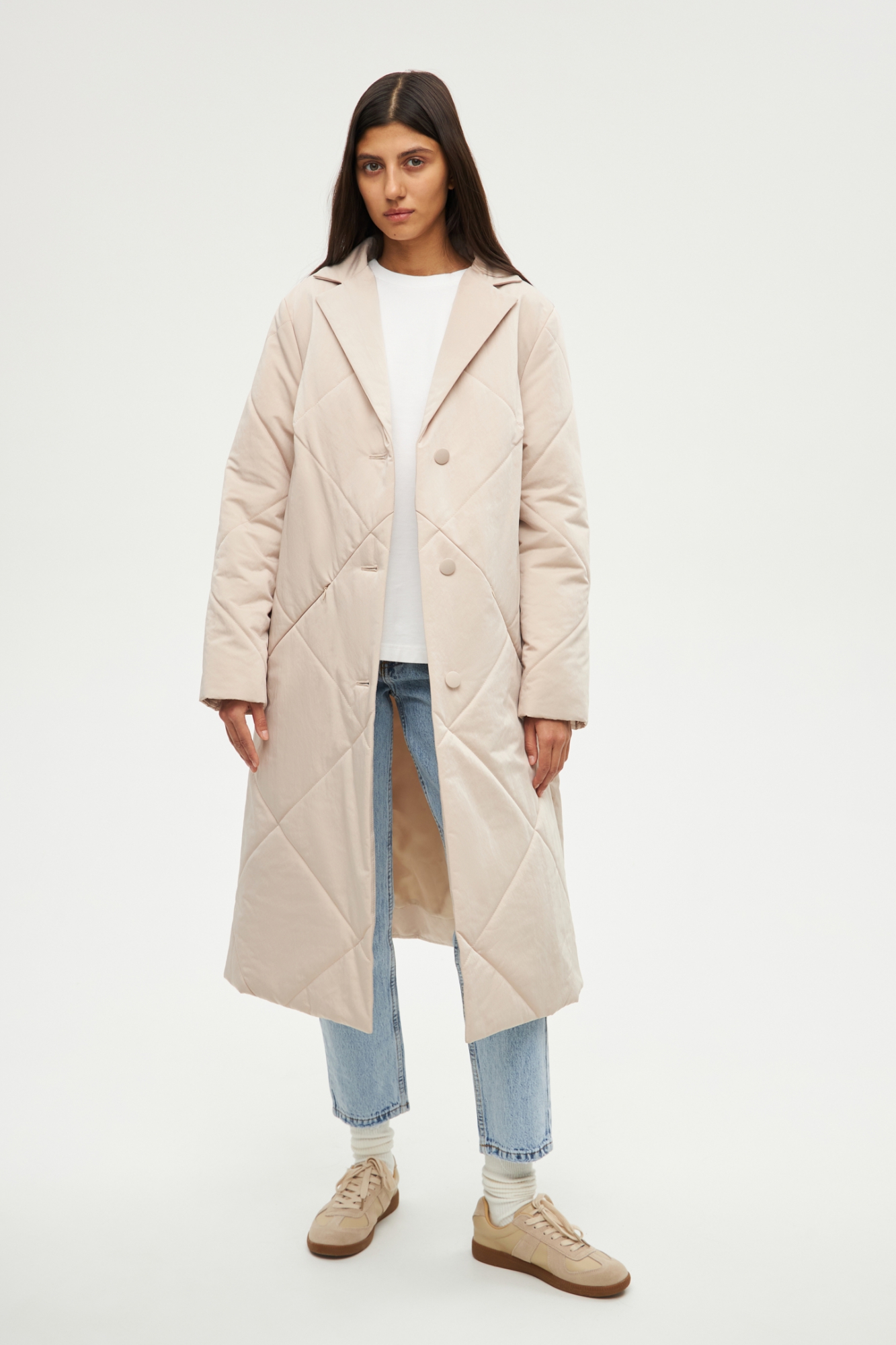 Стёганое однобортное пальто трапецивидного силуэта. Застёгивается на три пуговицы. Спереди - прорезные карманы с потайными молниями. Модель выполнена из плащёвой ткани на сверхтехнологичном утеплителе. Благодаря ему пальто очень лёгкое, воздушное и согреет вас в погоду от 0/-5°C до -10°C в зависимости от выбранной плотности утепления.