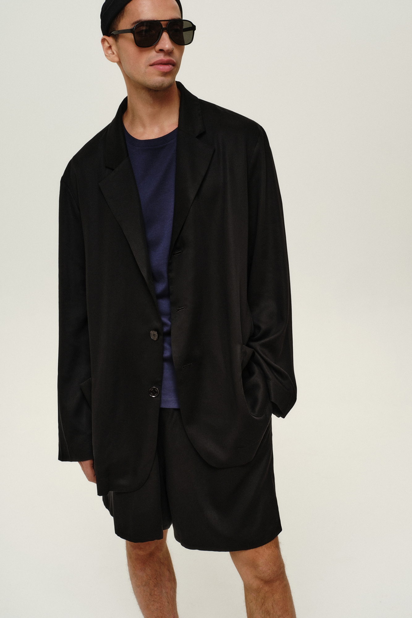 Элегантный кафтан свободного кроя. Атласный материал глубокого черного цвета и идеальные лацканы. Добавьте базовый низ, чтобы сбалансировать образ.
