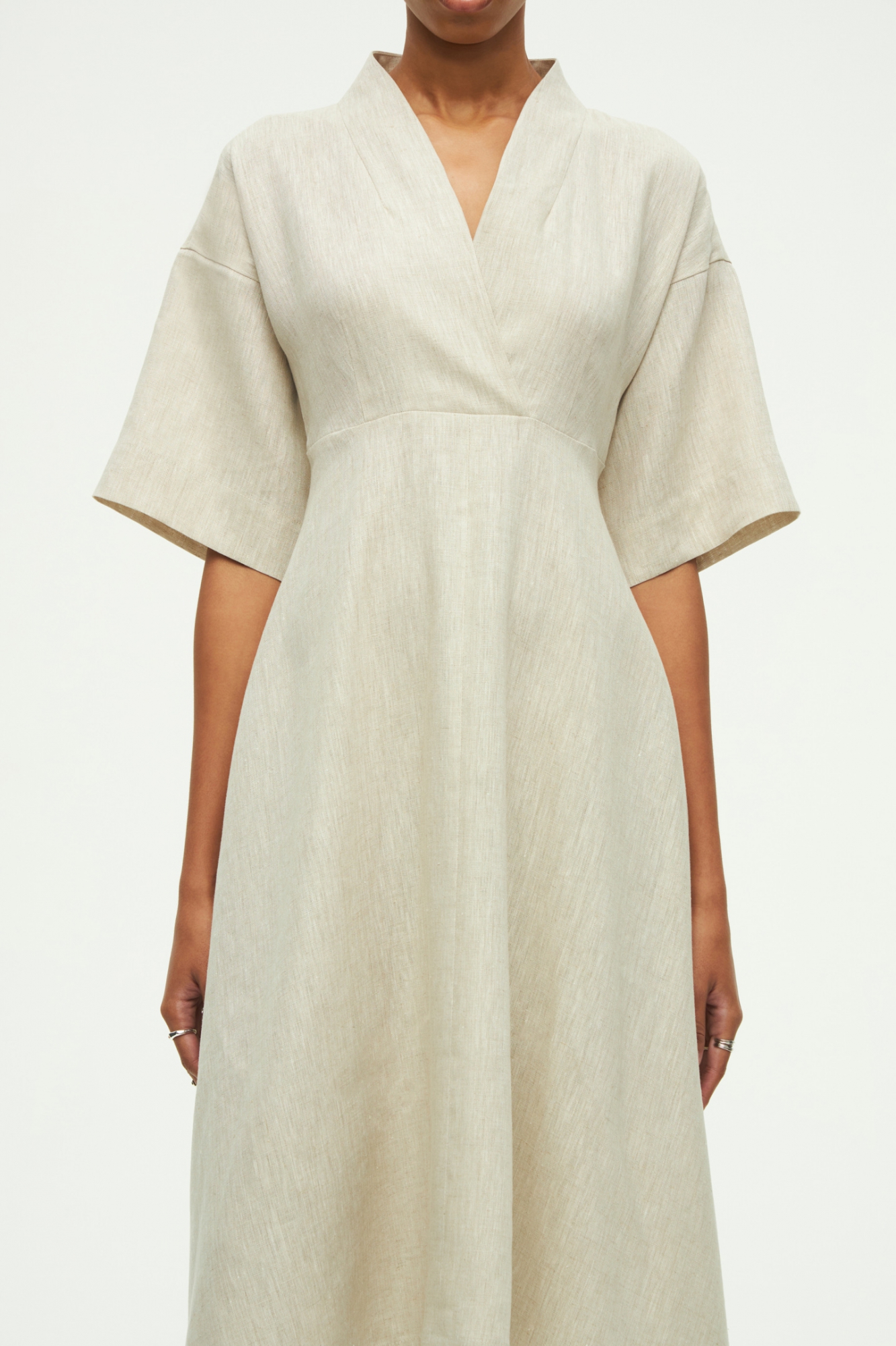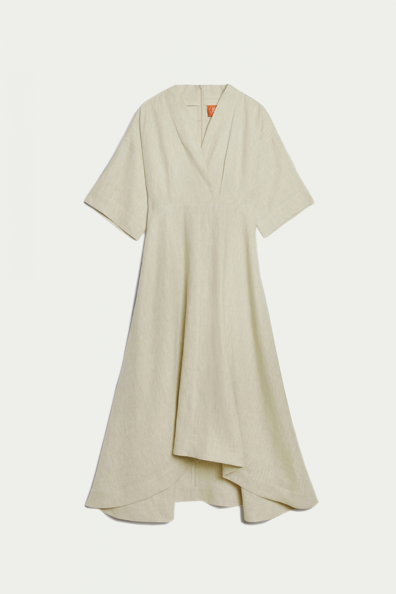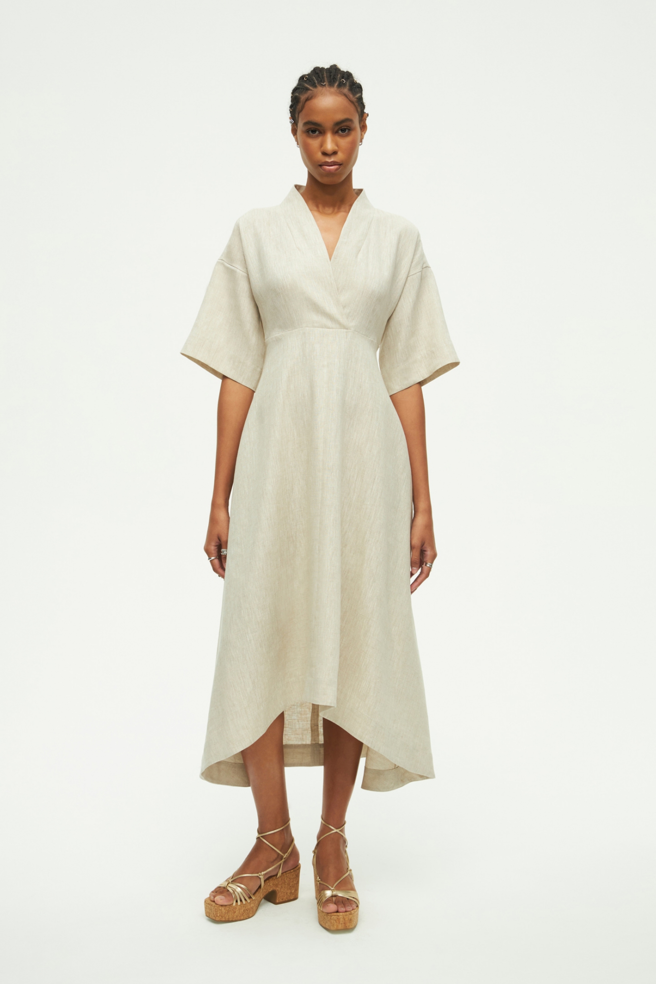 Когда всего одно изделие создаёт образ — это прекрасно! Льняное платье как раз из таких. Минималистичное, благородного цвета. С воротником-стойкой и спущенным плечом — оно одновременно и строгое, и расслабленное. Своим силуэтом платье напоминает лаконичность платьев-кимоно и подчёркивает фигуру. Сочетайте с босоножками на платформе или мюлями. И не забудьте про любимые кольца.