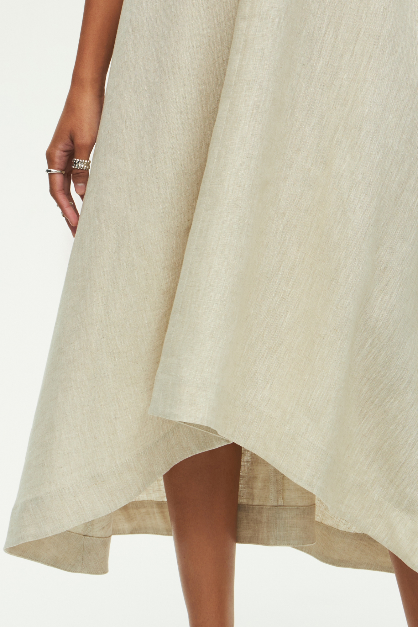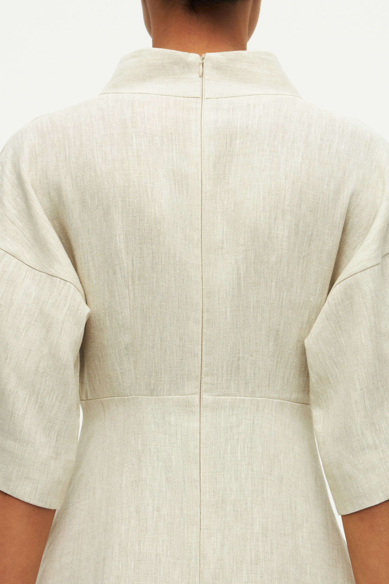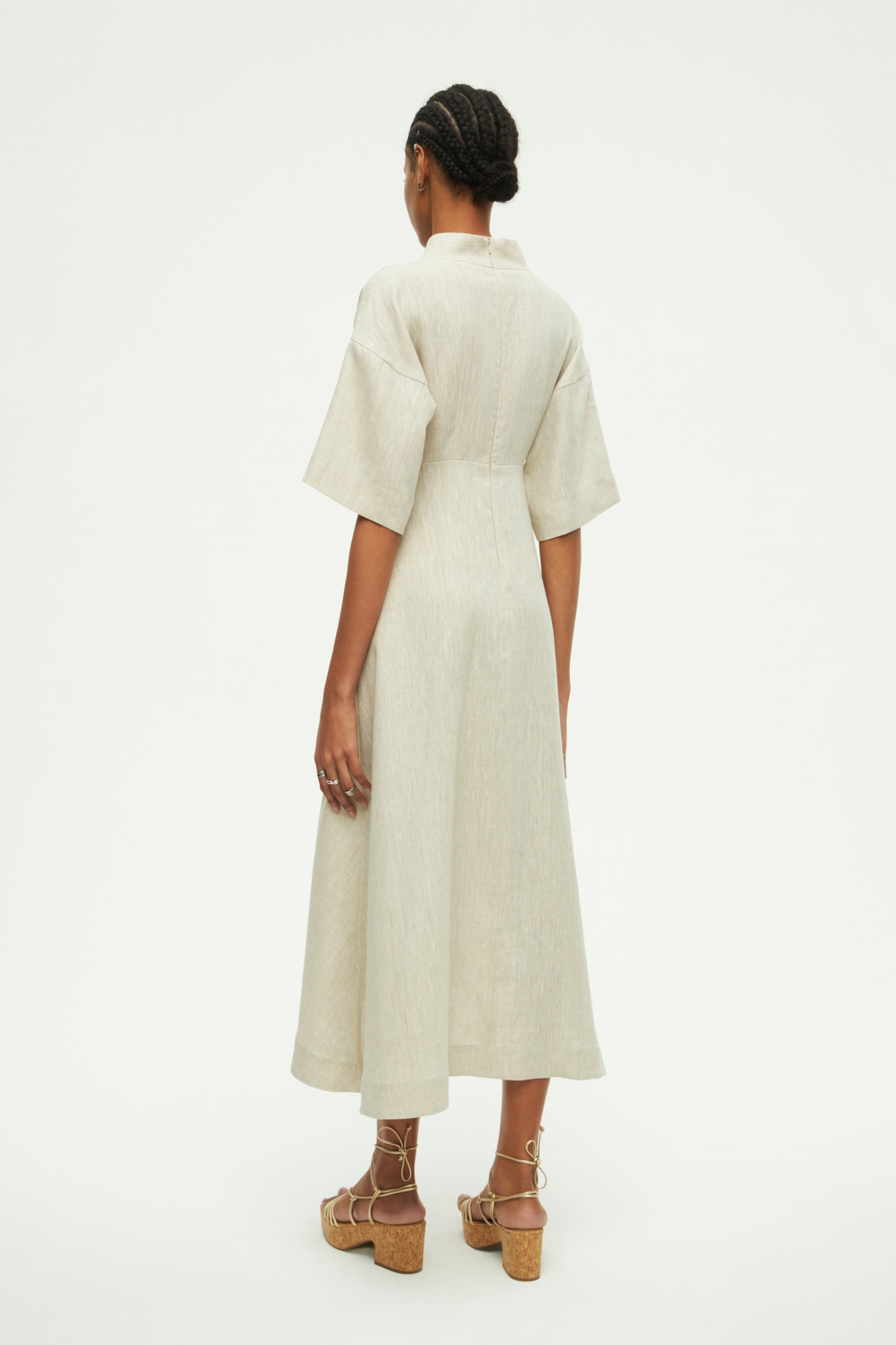 Когда всего одно изделие создаёт образ — это прекрасно! Льняное платье как раз из таких. Минималистичное, благородного цвета. С воротником-стойкой и спущенным плечом — оно одновременно и строгое, и расслабленное. Своим силуэтом платье напоминает лаконичность платьев-кимоно и подчёркивает фигуру. Сочетайте с босоножками на платформе или мюлями. И не забудьте про любимые кольца.