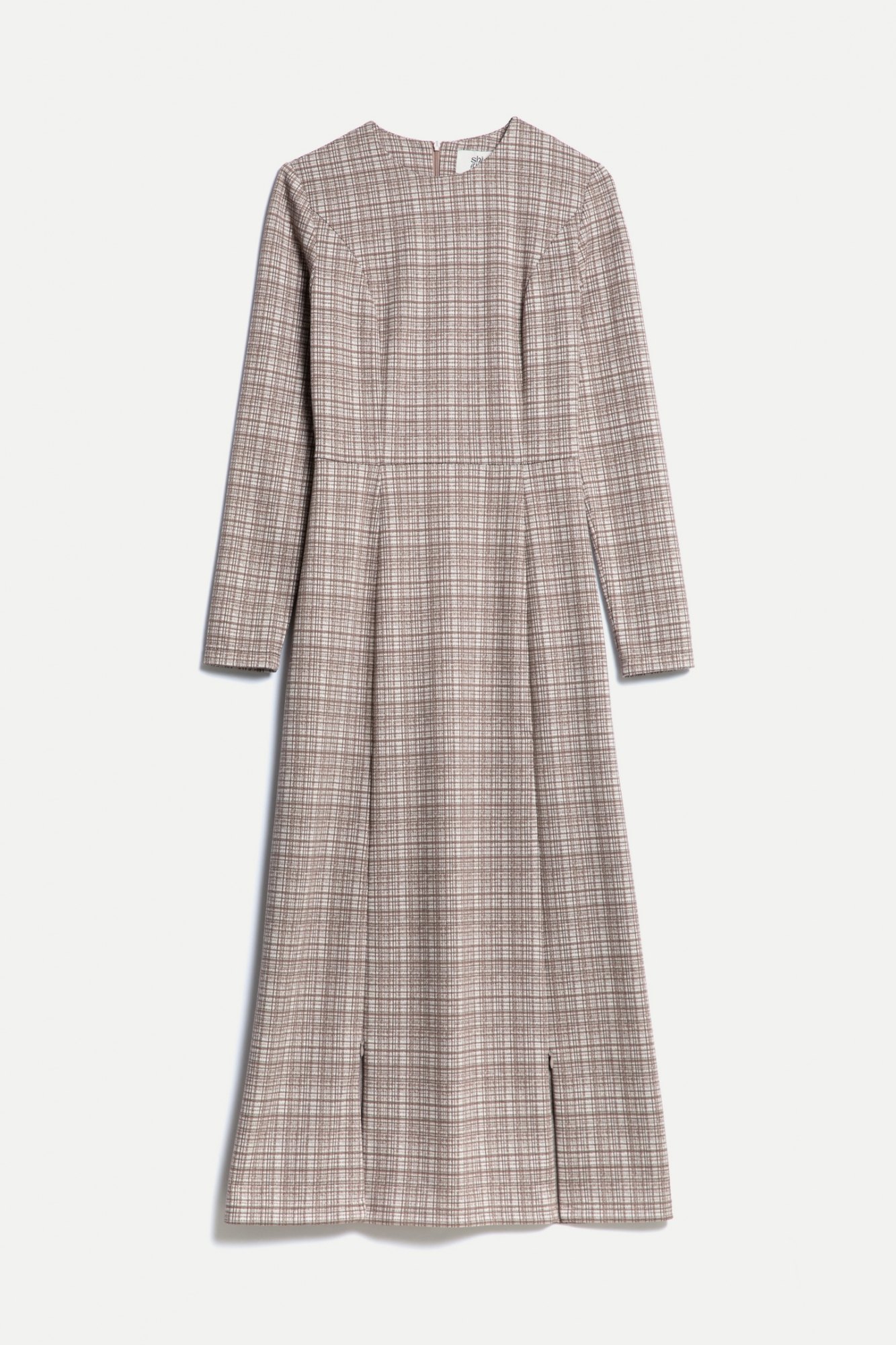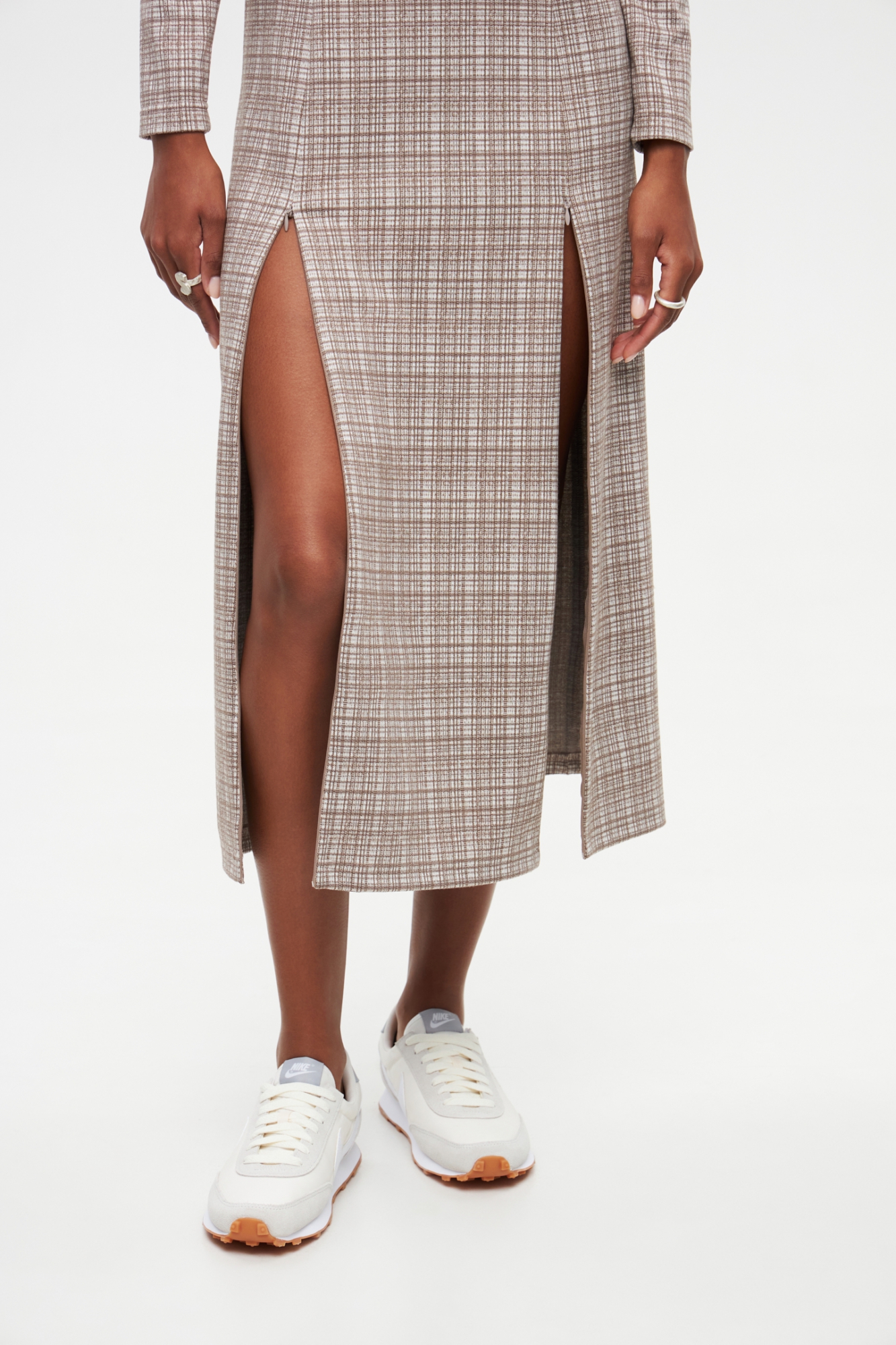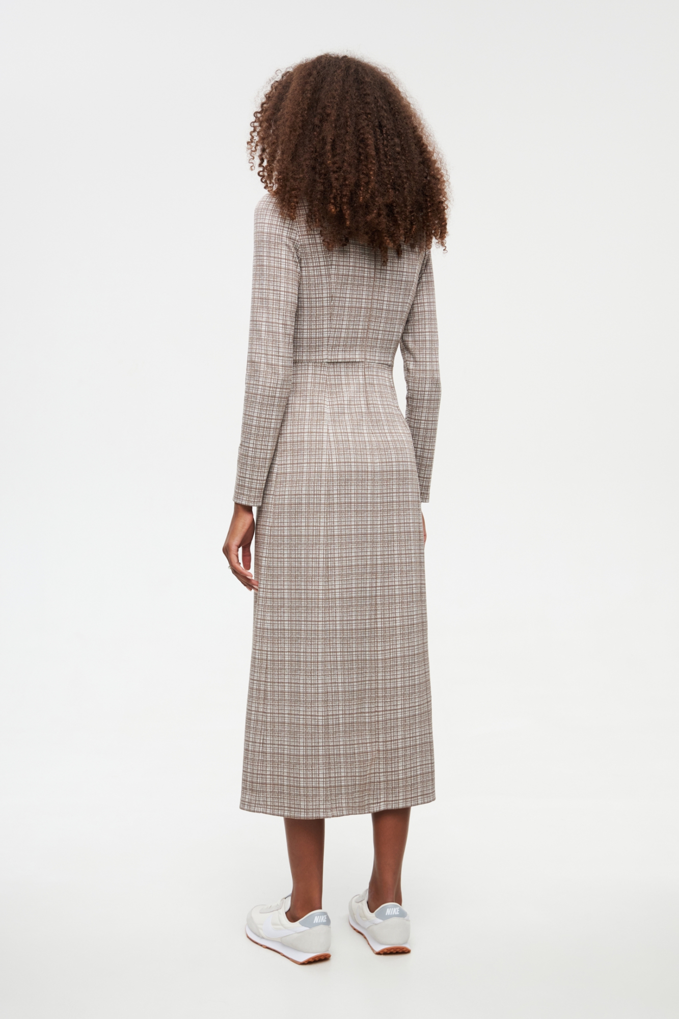 Платье миди в клетку – офисная классика. Модель прилегающего силуэта дополнено двумя разрезами на потайных молниях, которые позволяют самостоятельно регулировать высоту разреза в зависимости от ситуации и настроения. Платье выполнено из мягкого костюмного трикотажа.