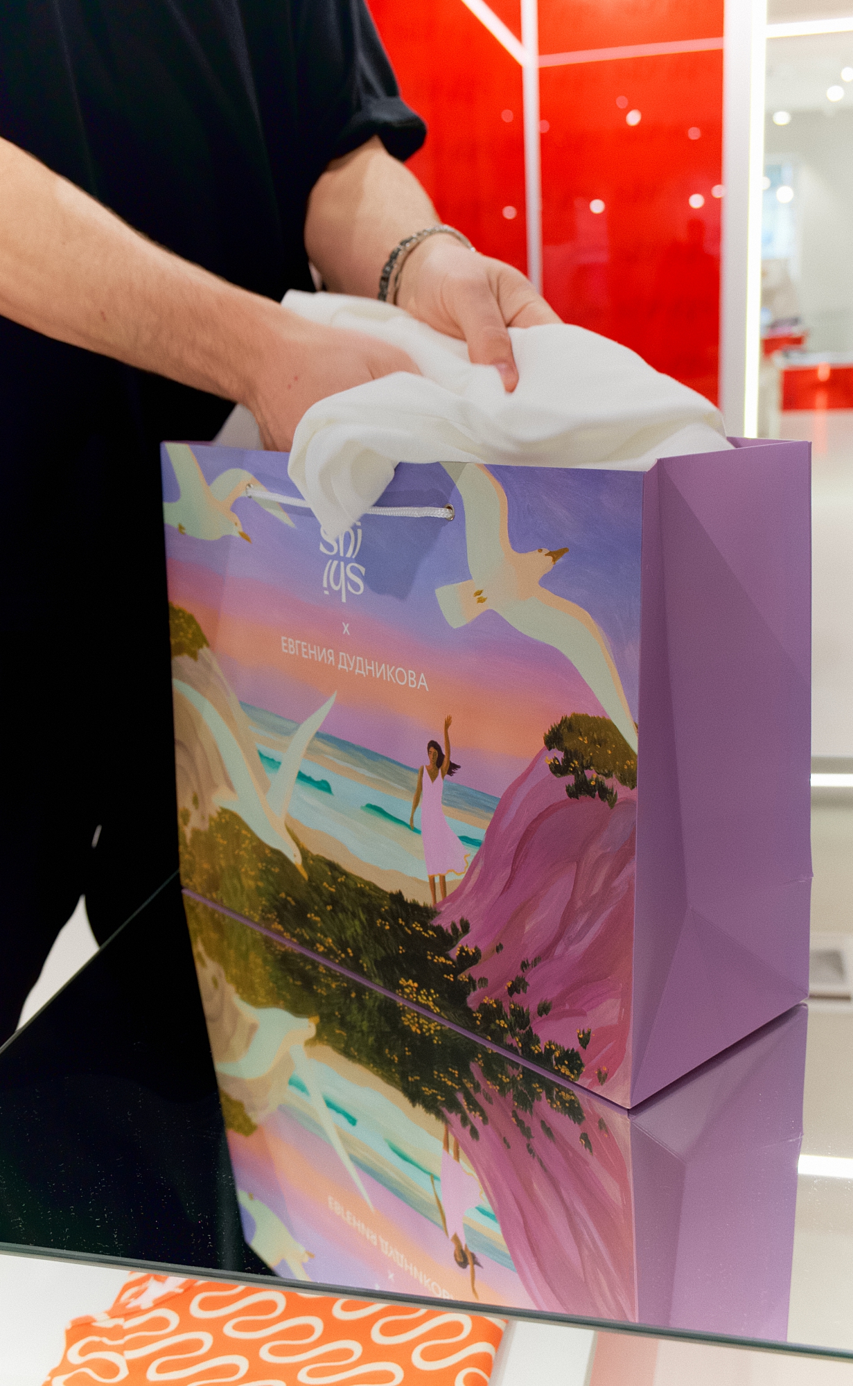 Картины современной художницы, пропитанные свободой, романтикой и летом, украсили пространство бутика, появились на брендированной упаковке и открытках, а сама Женя искусно разместила на окнах флагманского магазина цветущий сад.